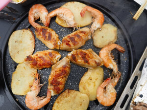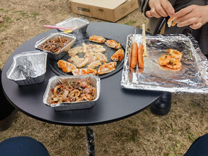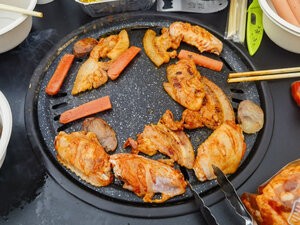 买的800的尺寸,可以放进后备箱,桌面很厚实,份量十足,桌腿也很结实,六七个人围着一起没问题,就是烤网的尺寸小了点,一次只能烤15串左右。