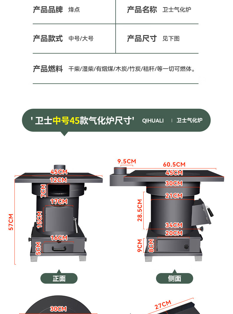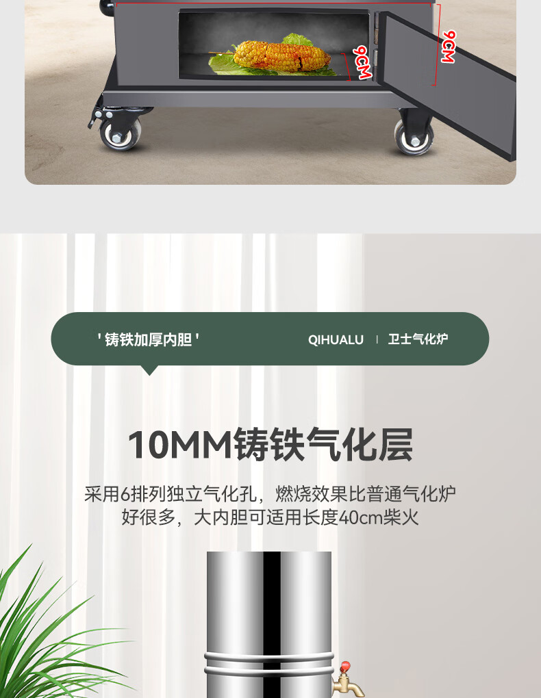烽点柴火灶气化炉无烟家用农村户外烧木柴取暖煤炭两用铸铁大锅台移动 50大号卫士炉带轮水箱3米管配件