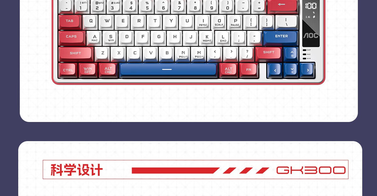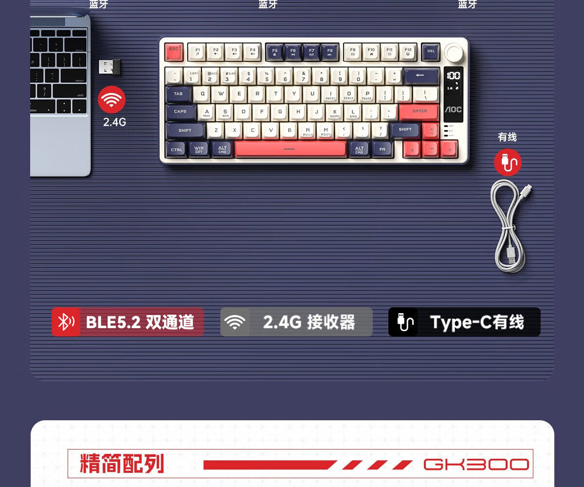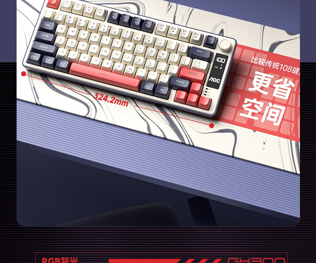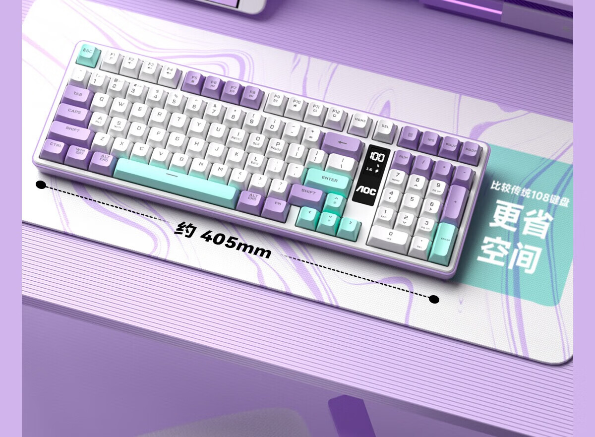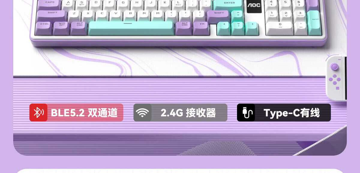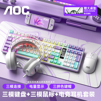 AOC GK300/GK320无线蓝牙有线三模键盘鼠标套装 多功能屏显机械手感拼色电竞游戏电脑办公键盘RGB背光 GK300键鼠桌垫三件套【紫幻青漾】