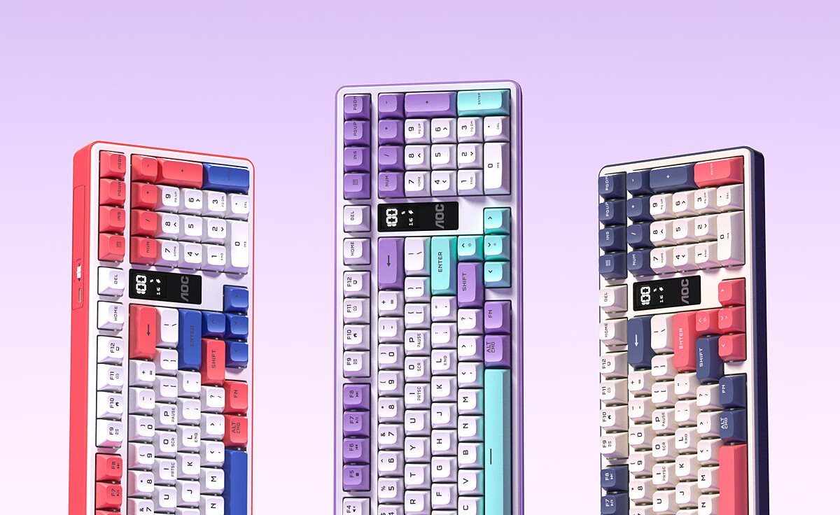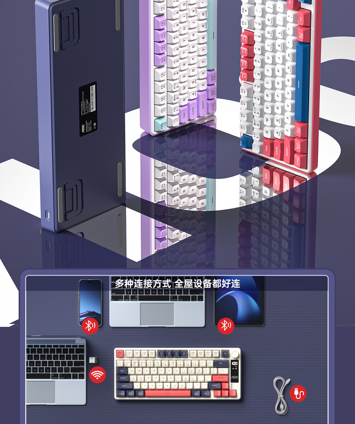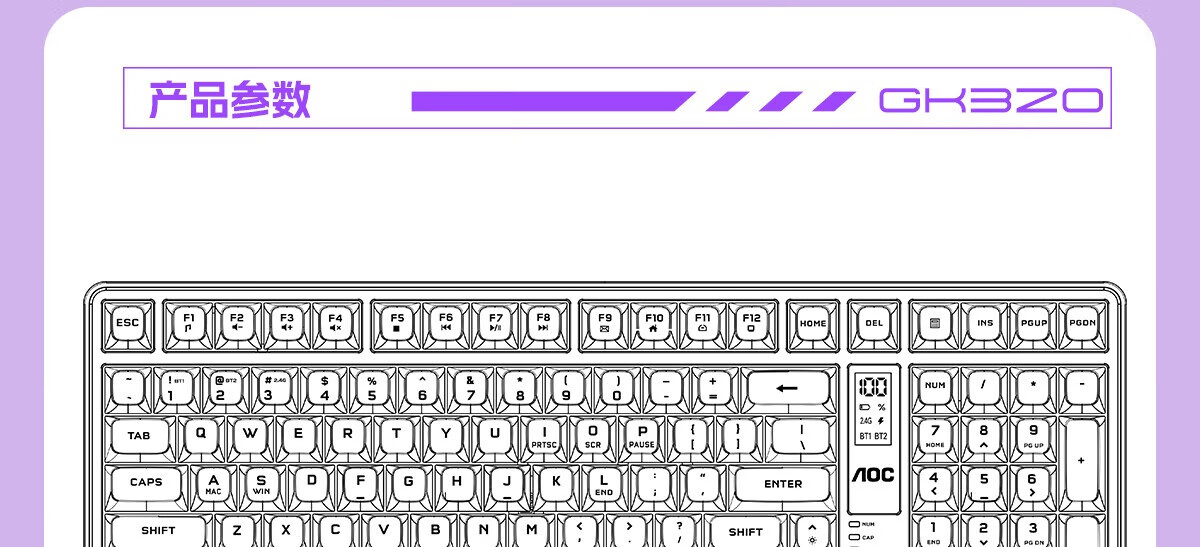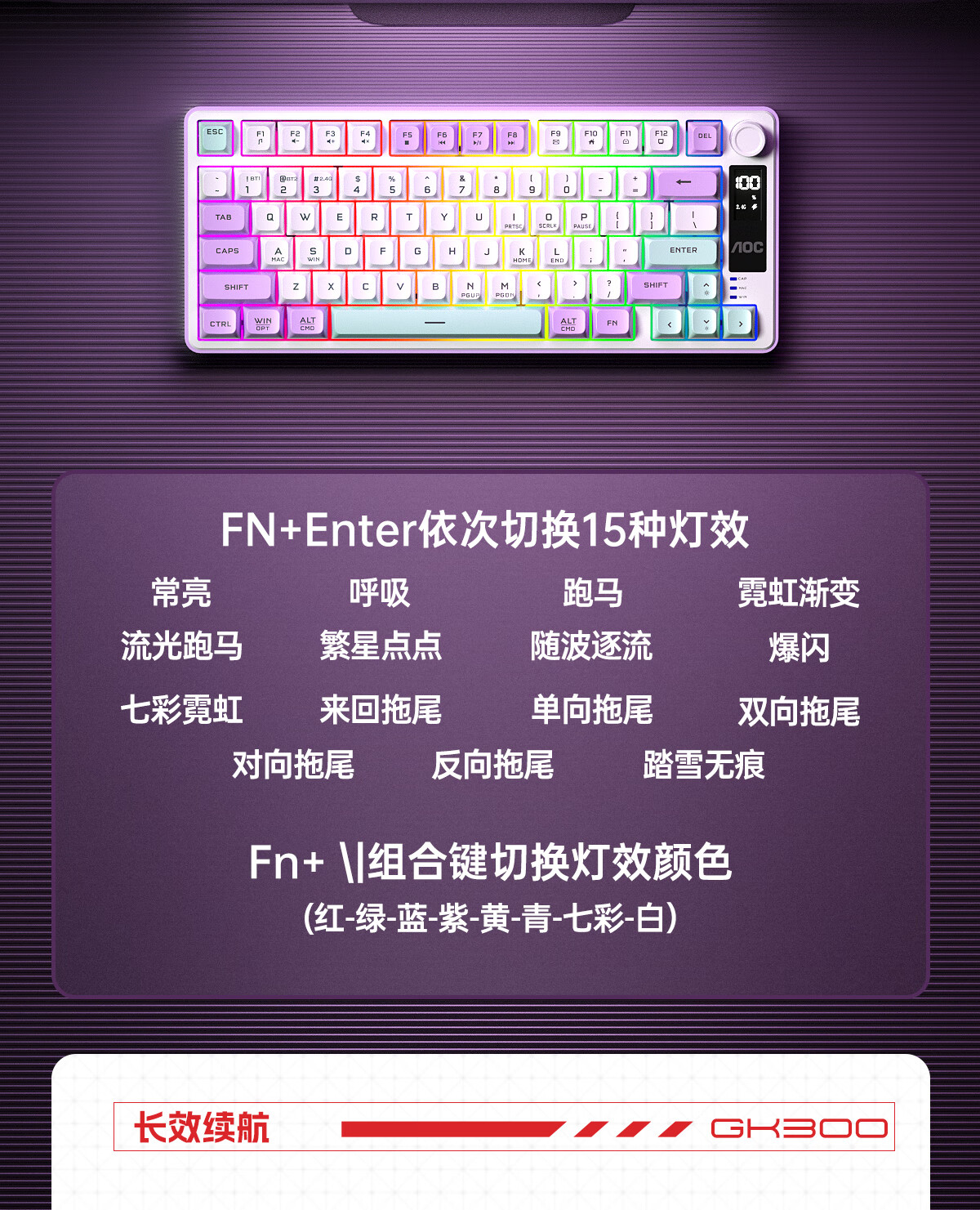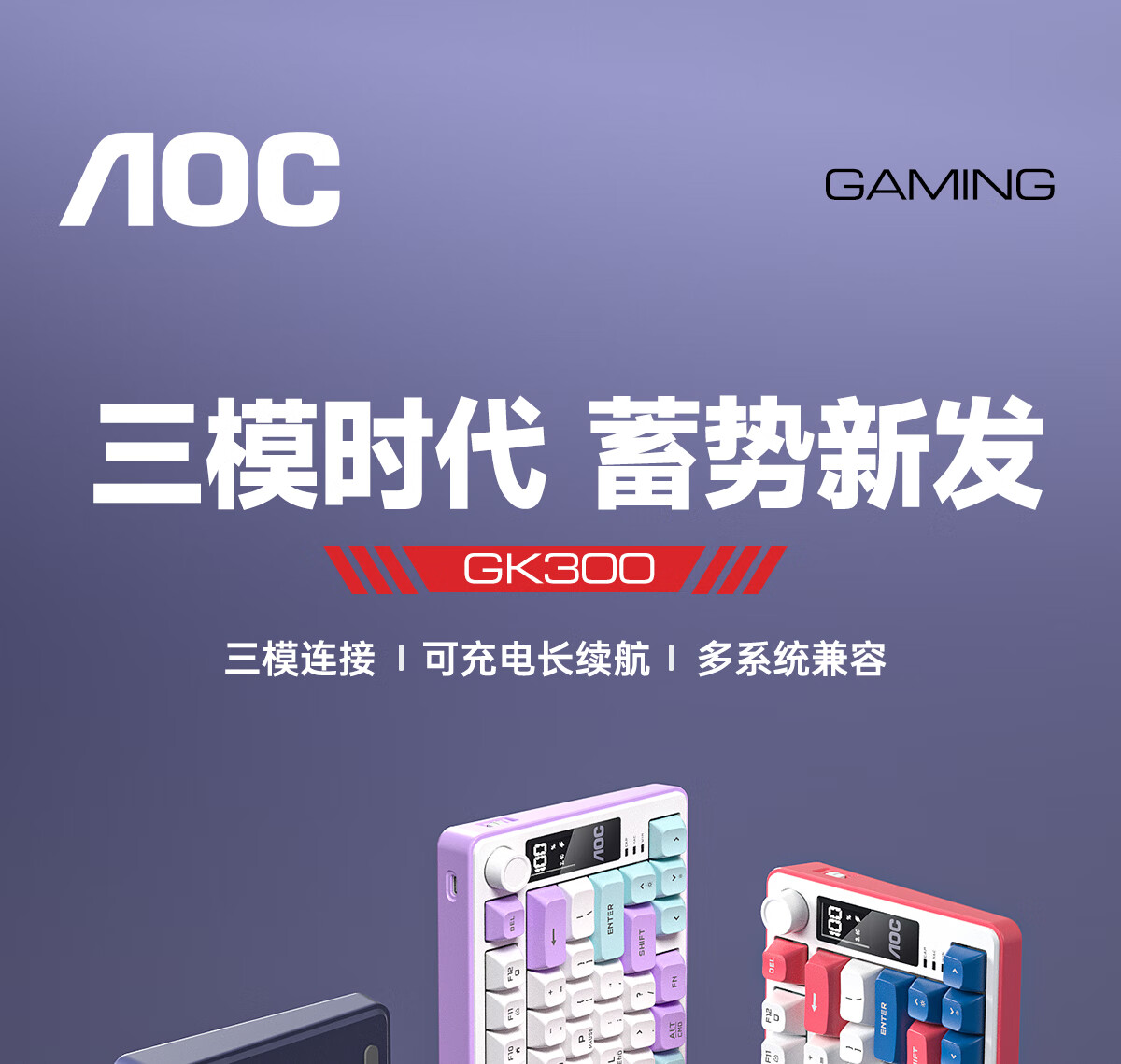AOC GK300/GK320无线蓝牙有线三模键盘鼠标套装 多功能屏显机械手感拼色电竞游戏电脑办公键盘RGB背光 GK300键鼠桌垫三件套【紫幻青漾】
