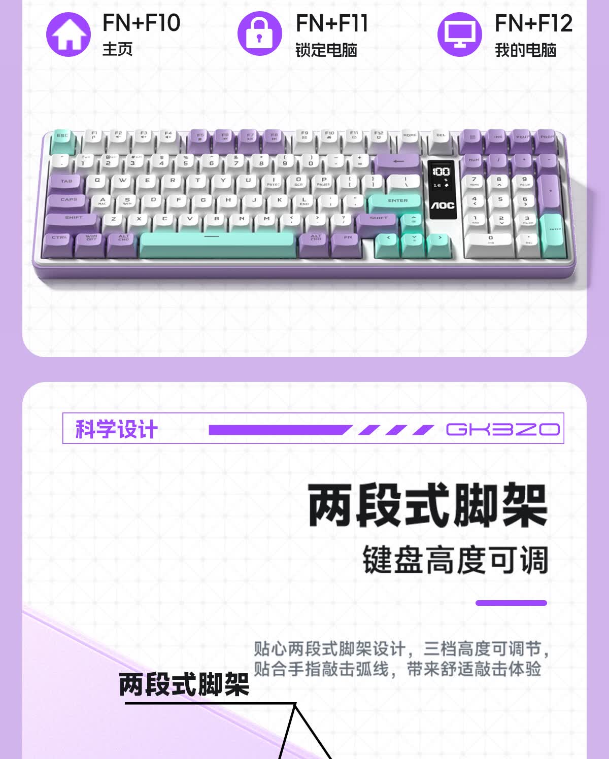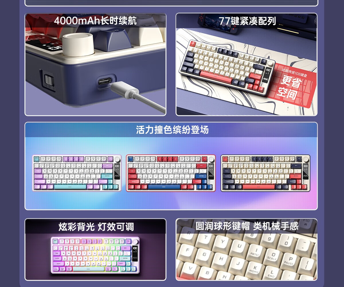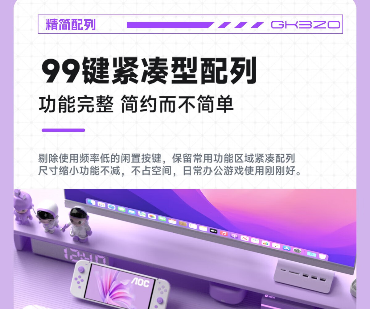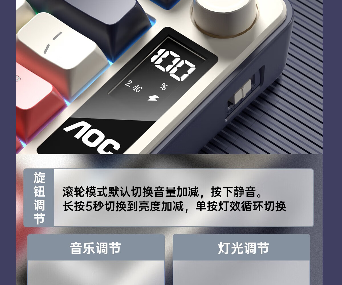 AOC GK300/GK320无线蓝牙有线三模键盘鼠标套装 多功能屏显机械手感拼色电竞游戏电脑办公键盘RGB背光 GK300键鼠桌垫三件套【紫幻青漾】