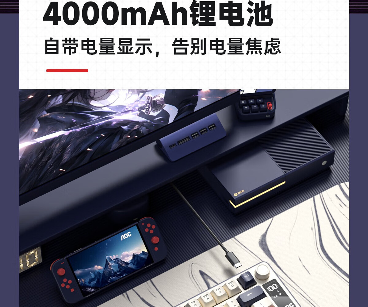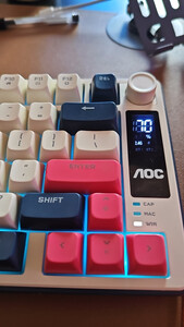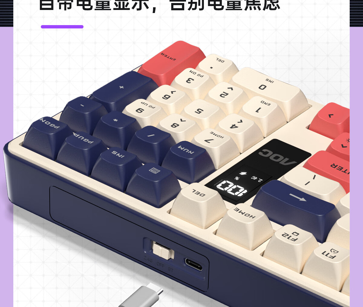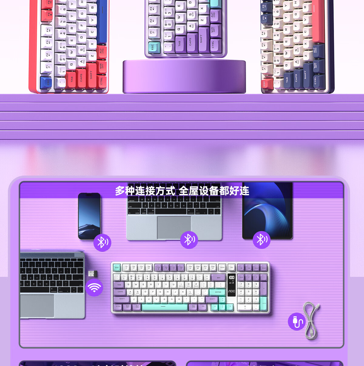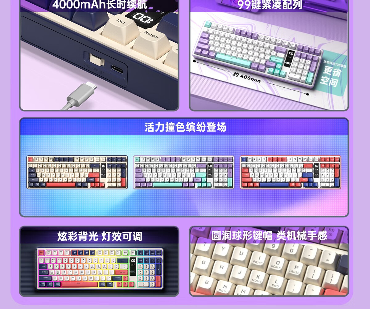 AOC GK300/GK320无线蓝牙有线三模键盘鼠标套装 多功能屏显机械手感拼色电竞游戏电脑办公键盘RGB背光 GK300键鼠桌垫三件套【紫幻青漾】