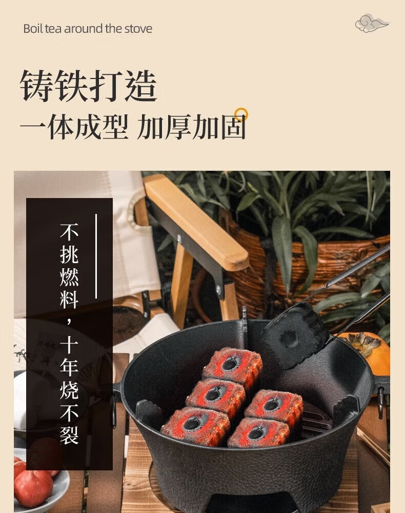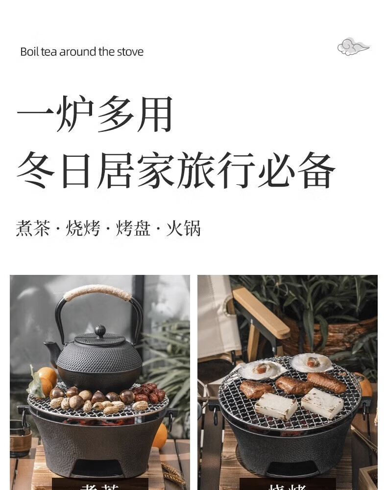 探险者围炉煮茶烧烤炉家用户外铸铁烤炉烧烤室内取暖炉烧烤火盆炉木炭 28CM铸铁炉+铸铁水壶+杯+5斤炭