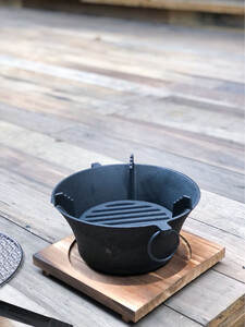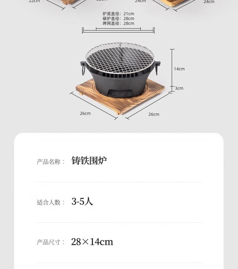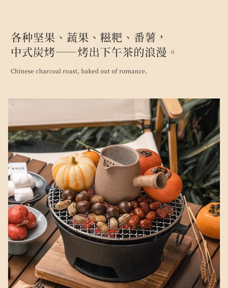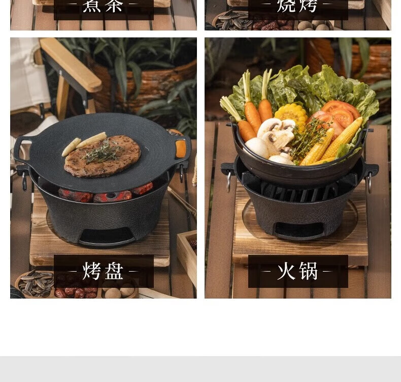 Nobana户外露营煮茶取暖炉铸铁碳炉野营家用木炭烧烤BBQ烤肉火锅碳烤炉 AHUI137 加大号28cm炉+木底座+圆形烤网30.5cm+烤