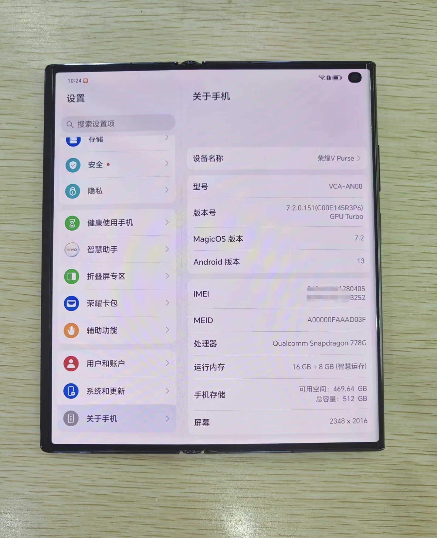 荣耀V Purse 折叠屏【全新未激活未拆封+全国联保】外折屏,2K超清大屏 ,厚度不足9mm,5G手机 雅黑色 12GB+256GB