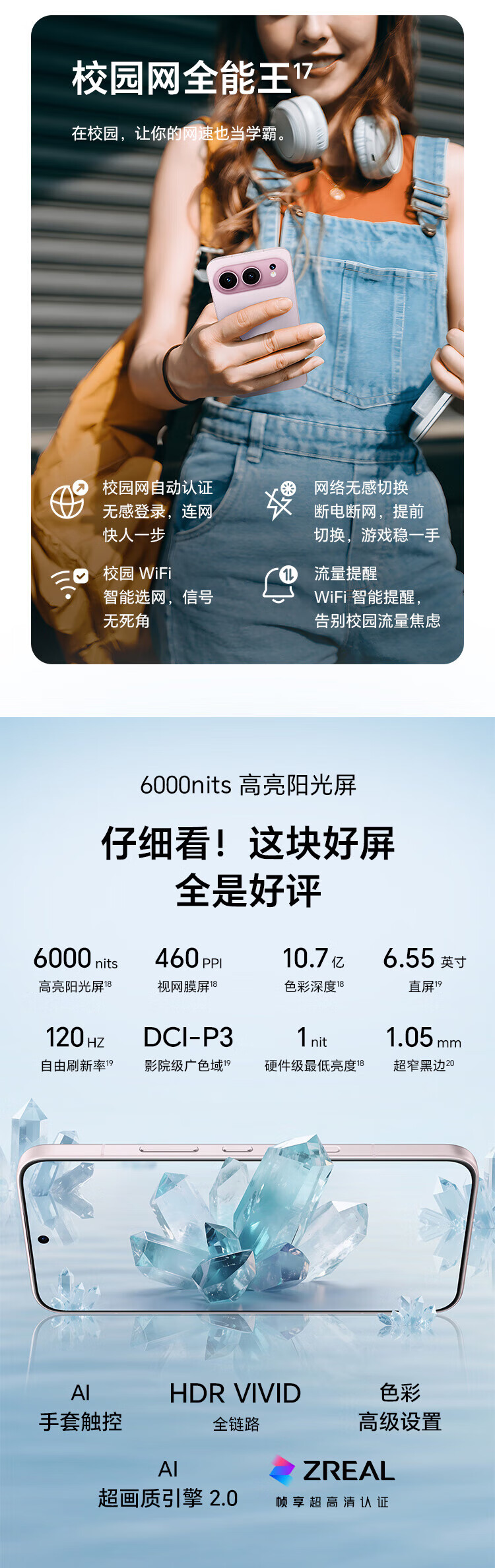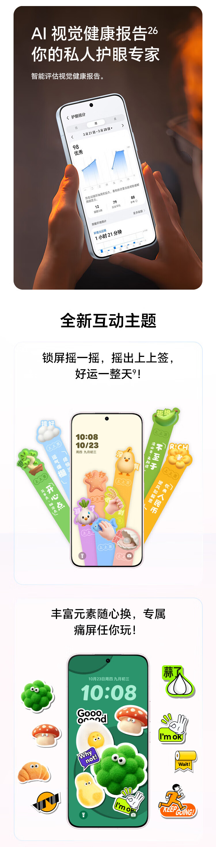 机身手感也超出预期,7.8mm厚度+185g重量,塞进超大电池还能保持这么轻薄,单手握持毫无压力。一体冷雕工艺的背板摸起来顺滑温润,还不容易沾指纹,我选的海蓝宝配色,渐变效果超耐看,质感完全不像千元机。6.55英寸的1.5K直屏特别舒服,120Hz高刷滑动起来丝滑流畅,3840Hz高频调光+护眼功能,晚上追剧久了眼睛也不酸胀,大太阳下屏幕亮度也足够,看清内容没压力。
