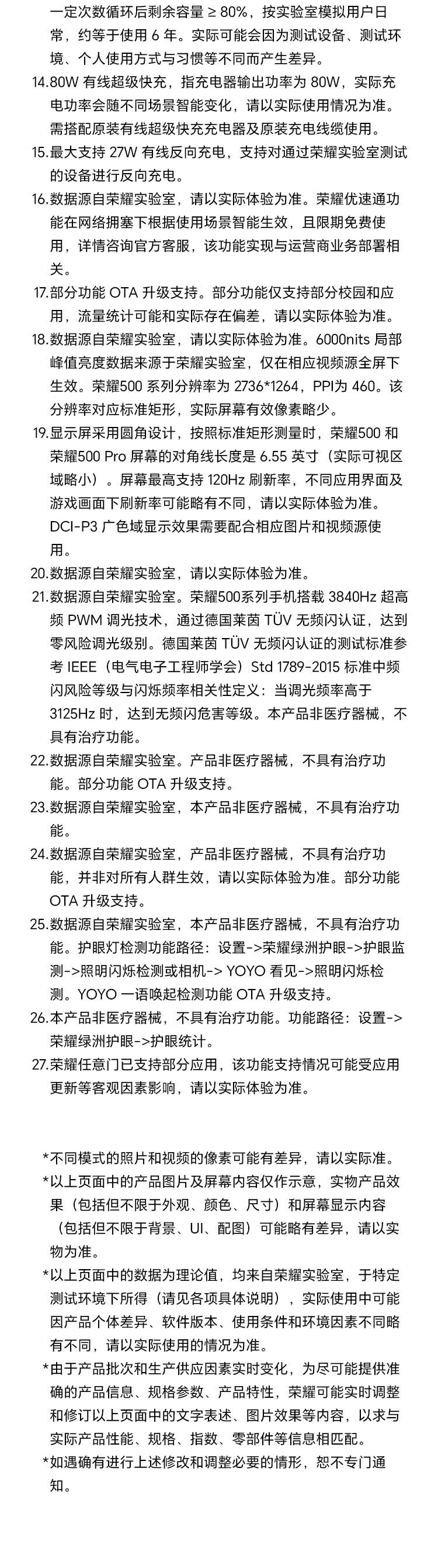 外包装采用塑封,彩盒内标配: ①手机(含内置电池)x1、②快速指南(含新机权益卡和电子三包凭证)x1、③HONOR SuperCharge充电器x1、④USB Type-C 数据线x1、⑤取卡针x1、