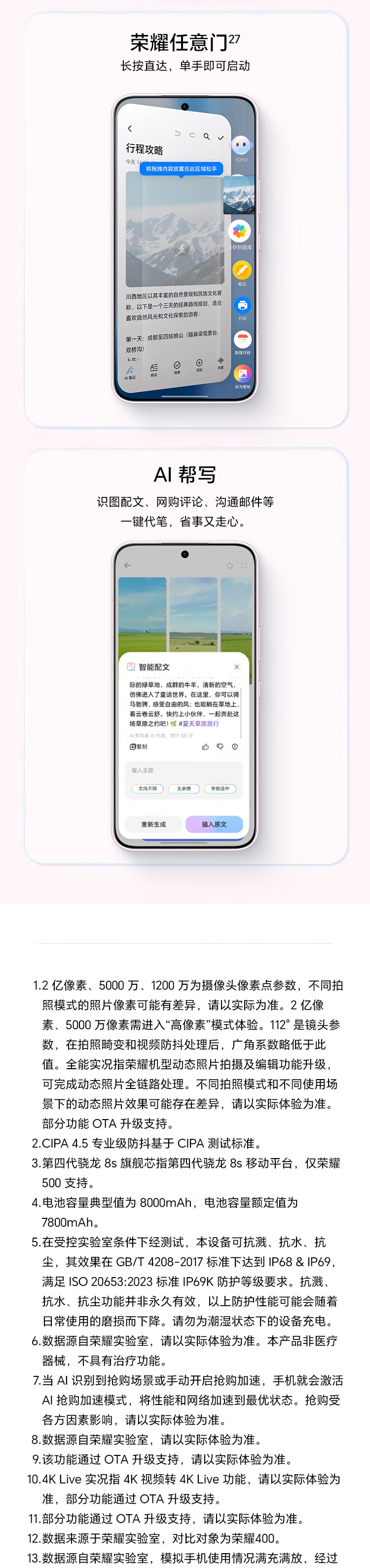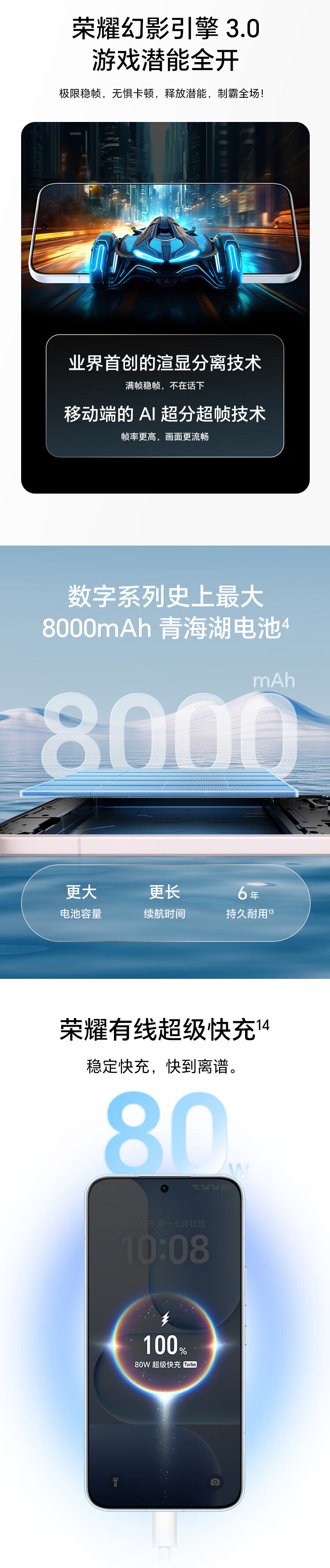 真的超出预期!渐变机身颜值超高,7.8mm超薄设计握感舒适,1.5K护眼直屏看着太舒服了。8000mAh青海湖电池续航绝了,重度使用一天还剩大半电,80W快充半小时就能满血。骁龙芯片运行流畅,王者满帧无压力,2亿主摄拍照清晰,日常扫码、夜景都能打。MagicOS干净无广,IP69K防水也超实