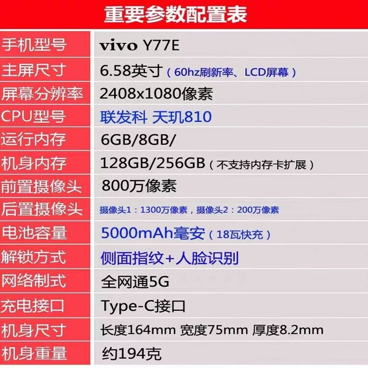 vivo y77e 6.58英寸护眼屏 200%超大音量 大内存长续航5G智能 晶岩黑 8GB+128GB(详情页有说明)