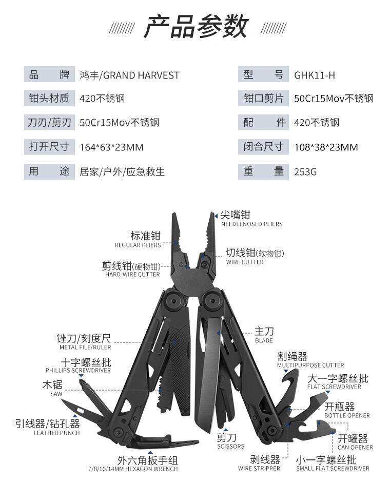 鸿丰(GRAND HARVEST)惊雷多功能工具钳折叠尖嘴钳户外露营工具钳子车载应急救援工具钳 惊雷GHK11银+批头组