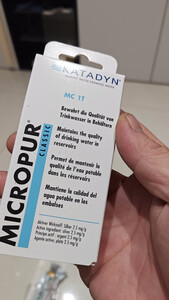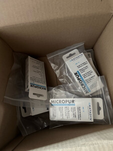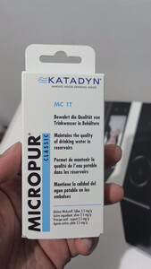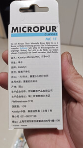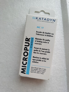 查了网上评价这款KATADYN净水效果好,红色和蓝色适合环境不同,各买了一盒,这盒蓝色的康迪水质净化便携式户外应急净水片MC MC 1T ,1盒是100粒,足够用了,而且有效期长,到2033年。物流快,送货上门,包装干净完整。