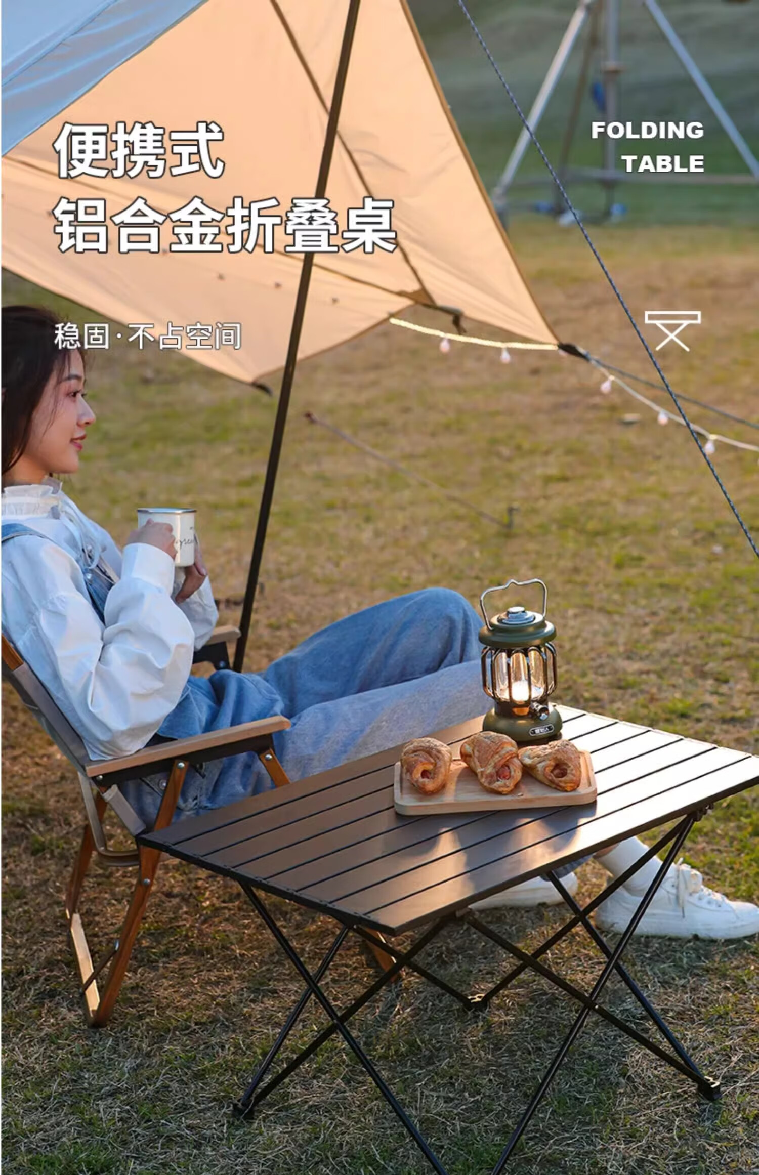探险者(TAN XIAN ZHE)户外折叠桌子便携式铝合金露营野餐蛋卷桌野外装备 黑色大号+米色克米特椅*1
