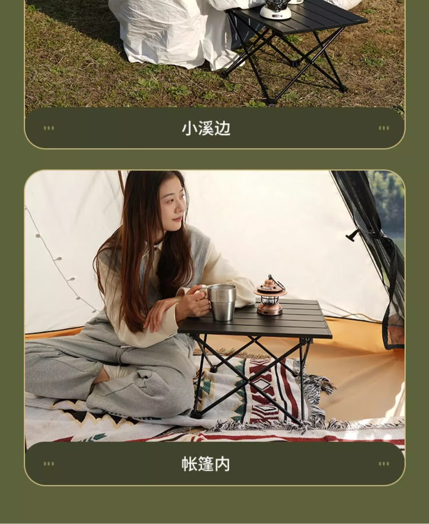 超级无敌好评,东西很有质感,纯铝合金的,支架也是铝合金的,很轻便,收纳之后体积很小,携带方便,之前买的碳钢蛋卷桌太大了,十斤重,而且携带很不方便。当然,就是因为太轻便,承重量有限,不能重压,这是个小小的缺点,大小也很合适,泡个茶打打牌很好。