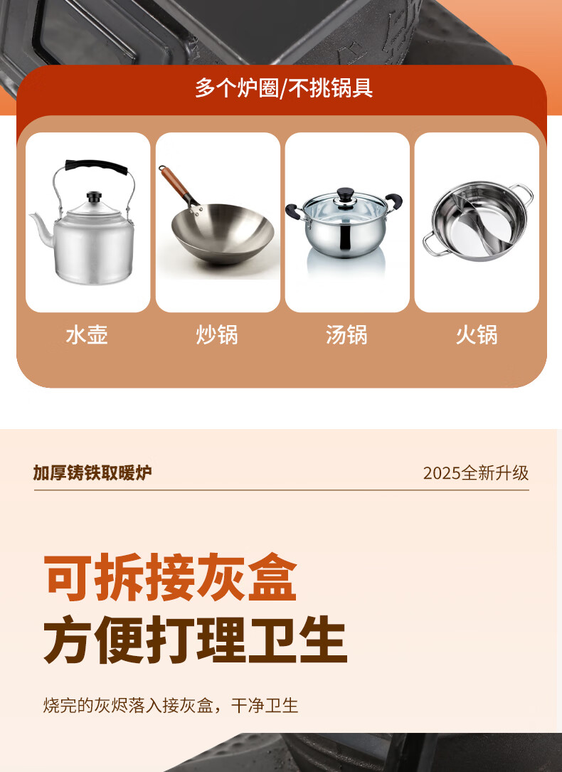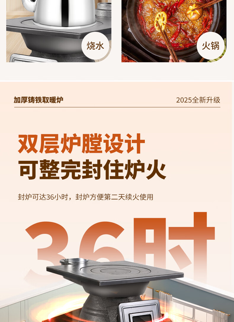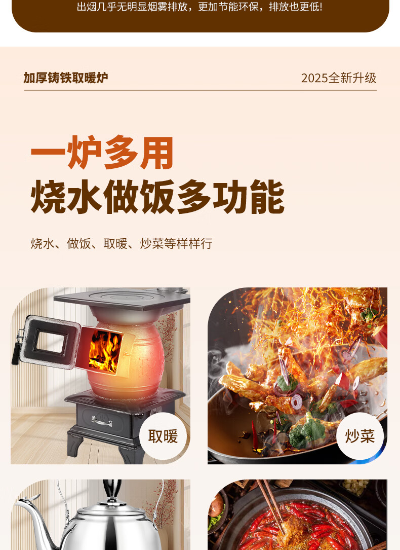 炉子很不错,老人非常满意,烧水也很快很好很方便,又节约柴火,老人在家老灶用很麻烦,就这个炉子很方便,烧火做饭取暖很齐全,完美!
