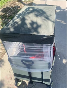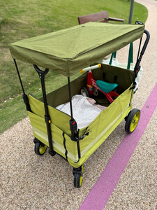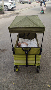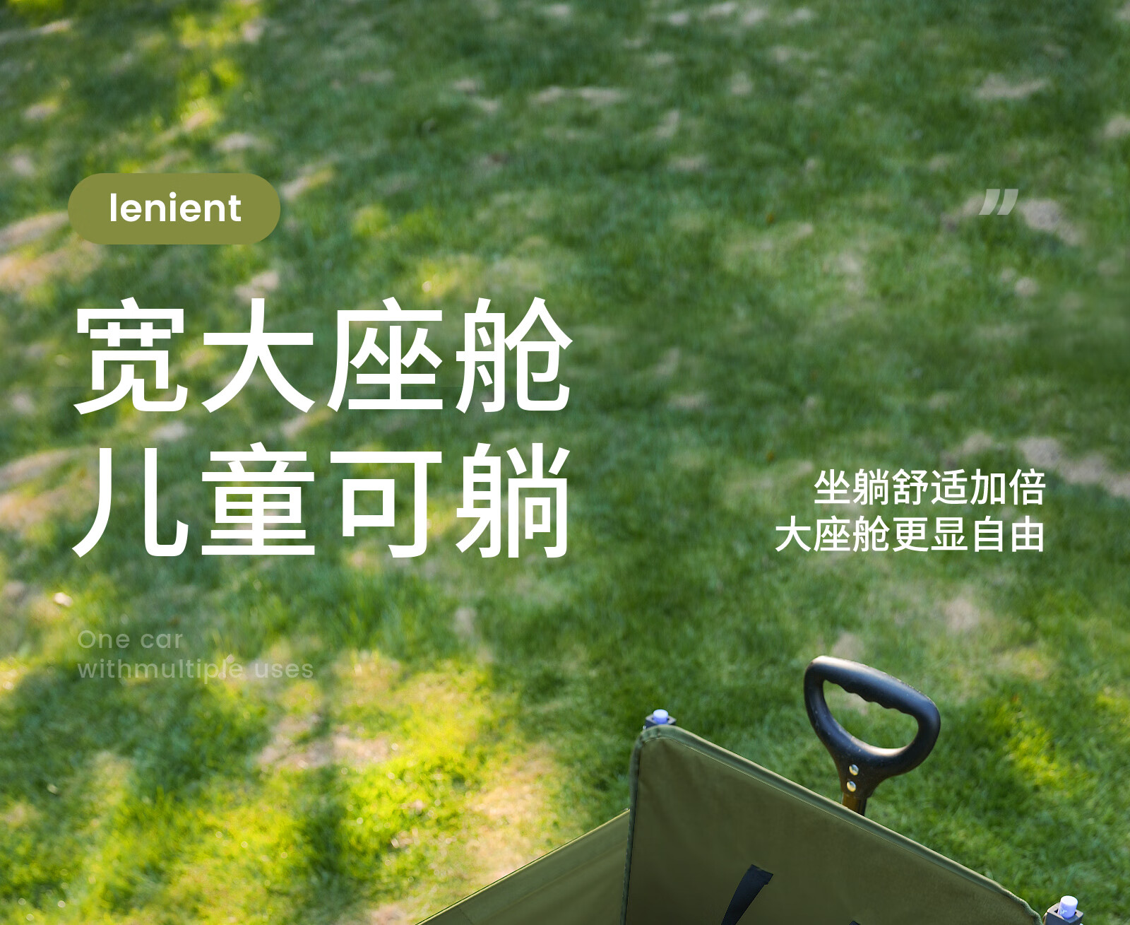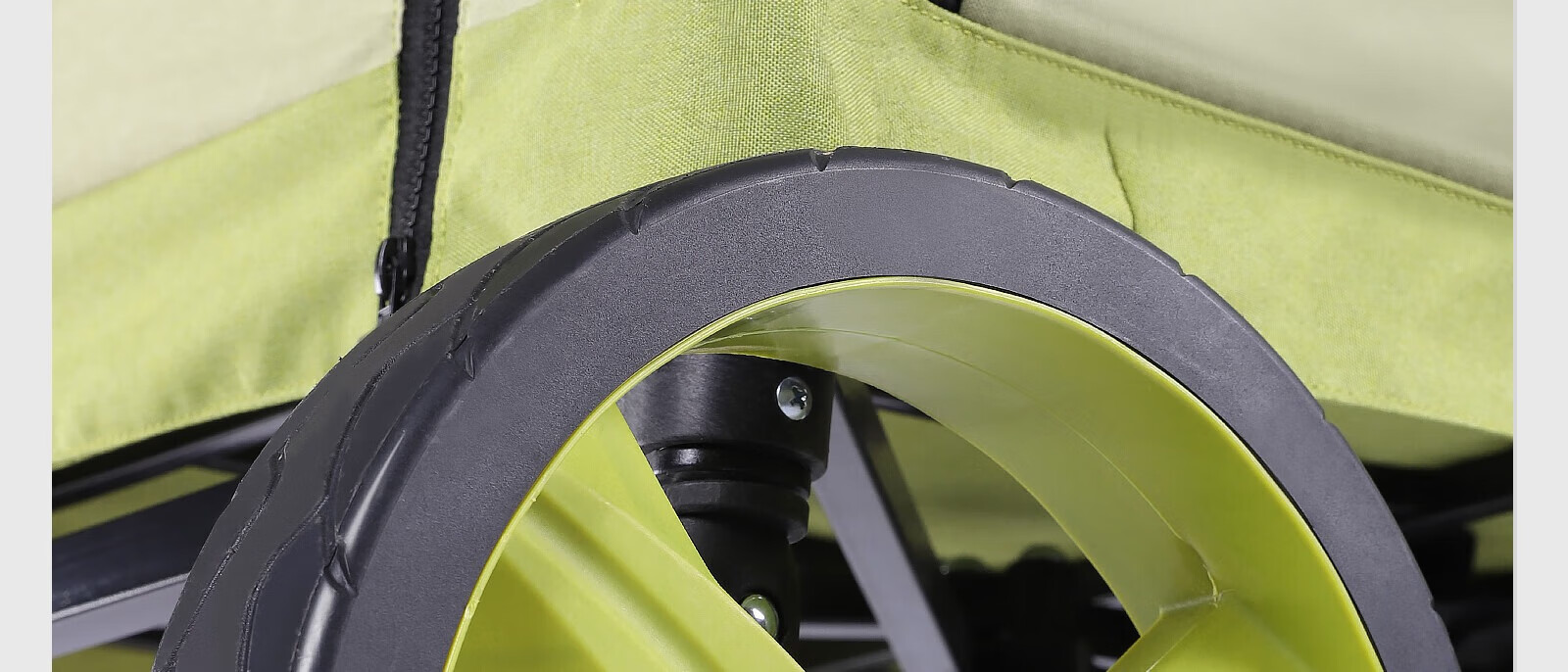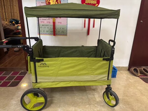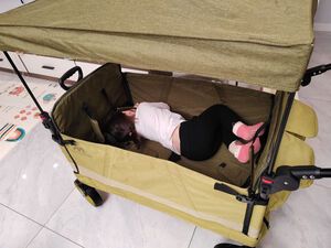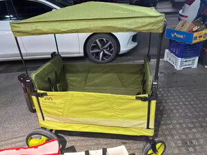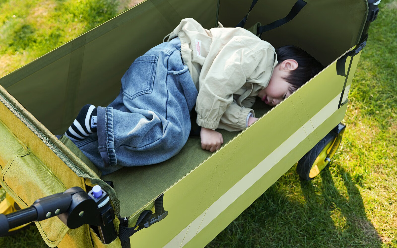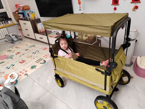 结实,承重好,车轮减震优秀,单单减震这点,秒杀所有普通露营车,遮阳棚,遮阳,同时不阻挡视线,车身加大加长,侧边拉链打开还能当座椅,小孩子在上面也可以躺可以轻松遛娃,卖家回复超快,态度特别好
