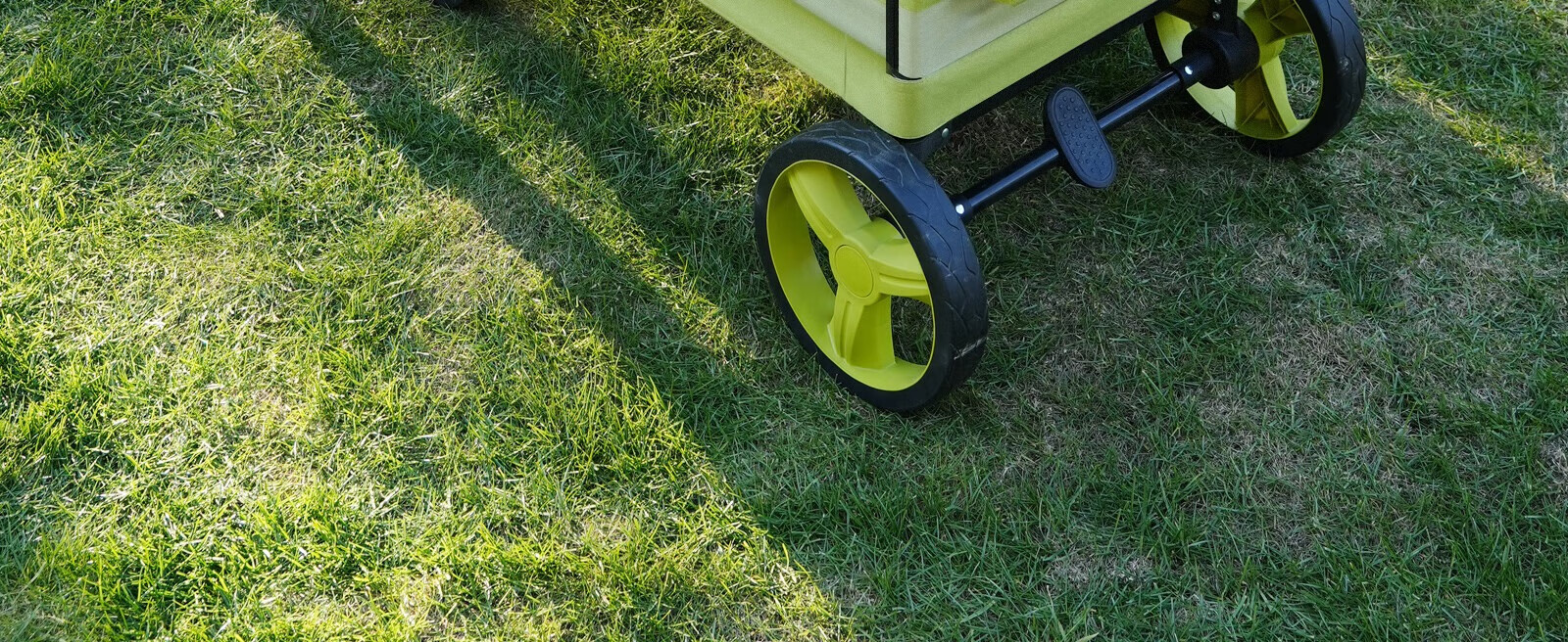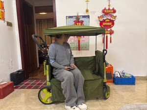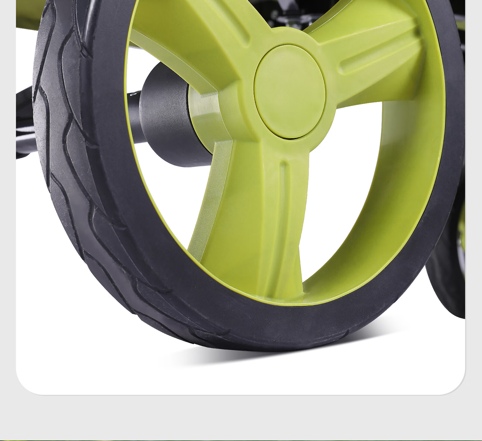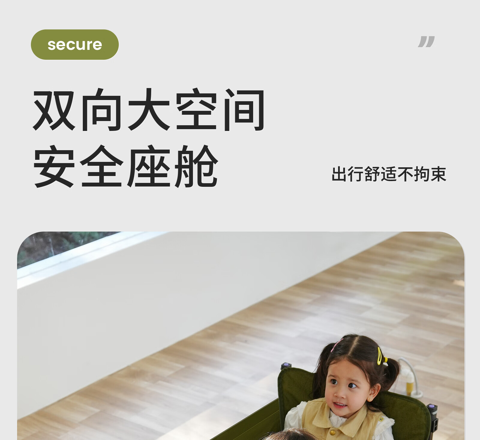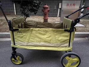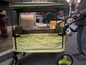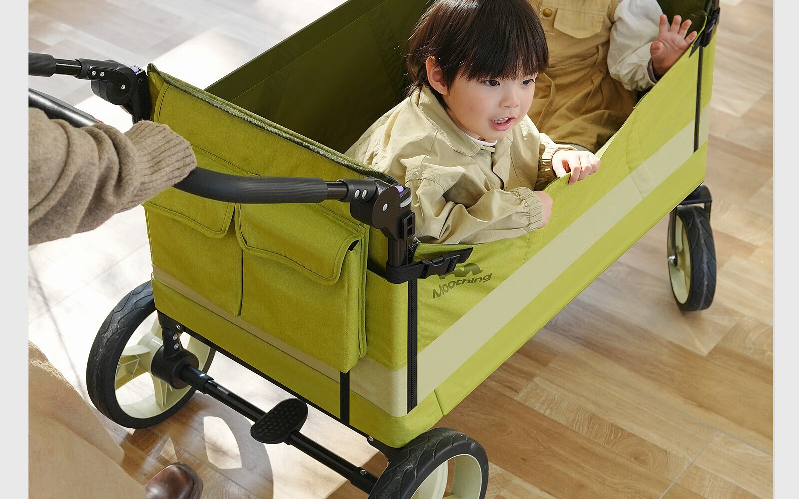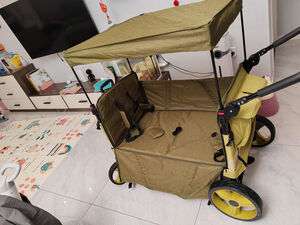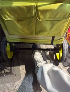 轮胎尺寸合理,前轮万向灵敏掌握方向,后轮大轮推起来非常轻便,车斗轻松坐下两个小朋友,侧面打开还可以当座椅。折叠后家里随手一放,不占空间。