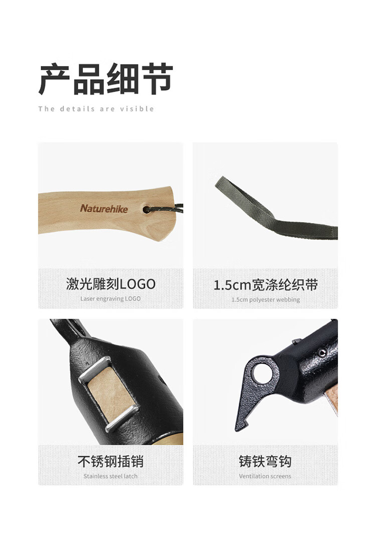产品重量:合适,趁手 产品材质:木柄手感可以,纹理估计是随机的这个看起来一般 适用场景:还没用过,现在办公室里当摆设 适合人群:户外轻奢露营 便捷性能:有个手绳和挂绳挺方便的,好用