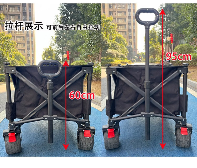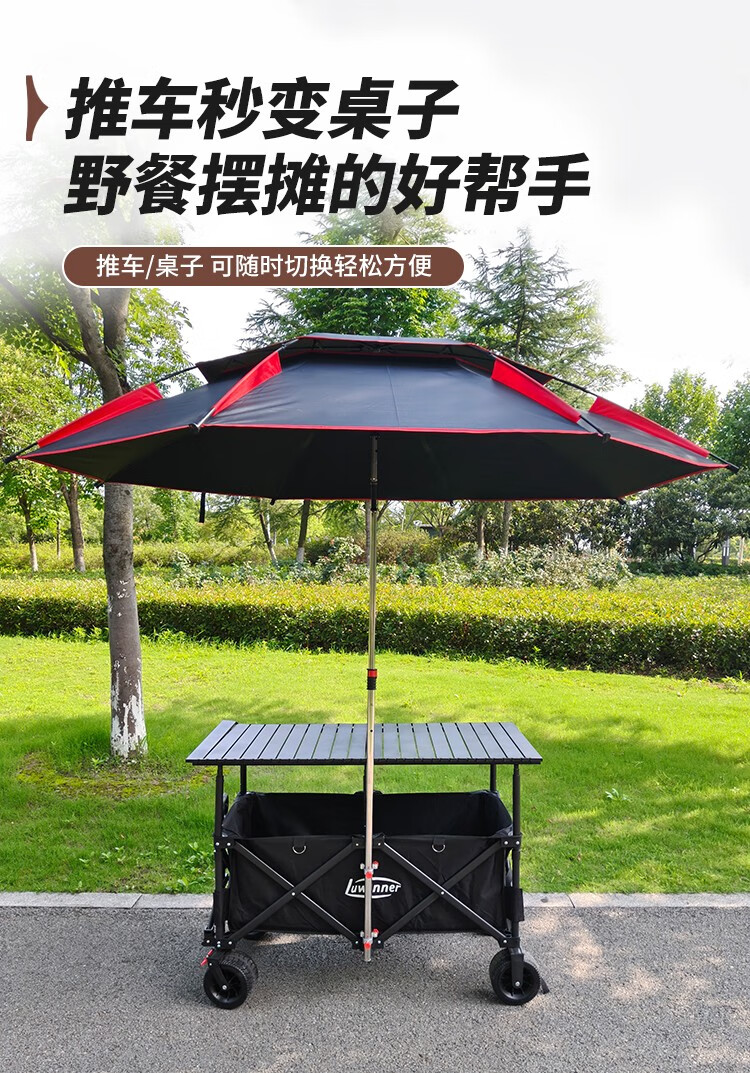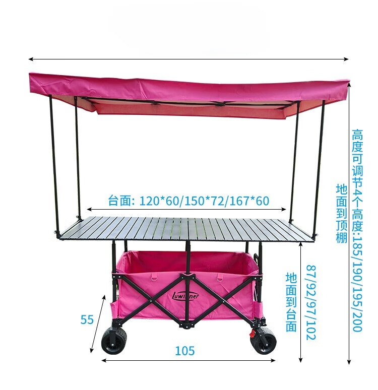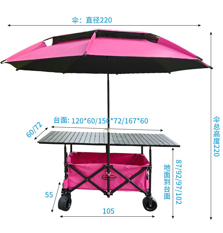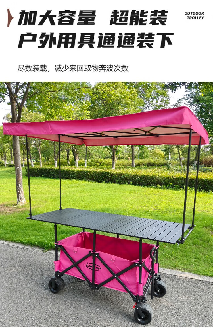 加大露营车摆摊手推车升降桌折叠夜市小吃车大容量地摊车户外推车 双底-粉车+167*60黑桌+粉大伞
