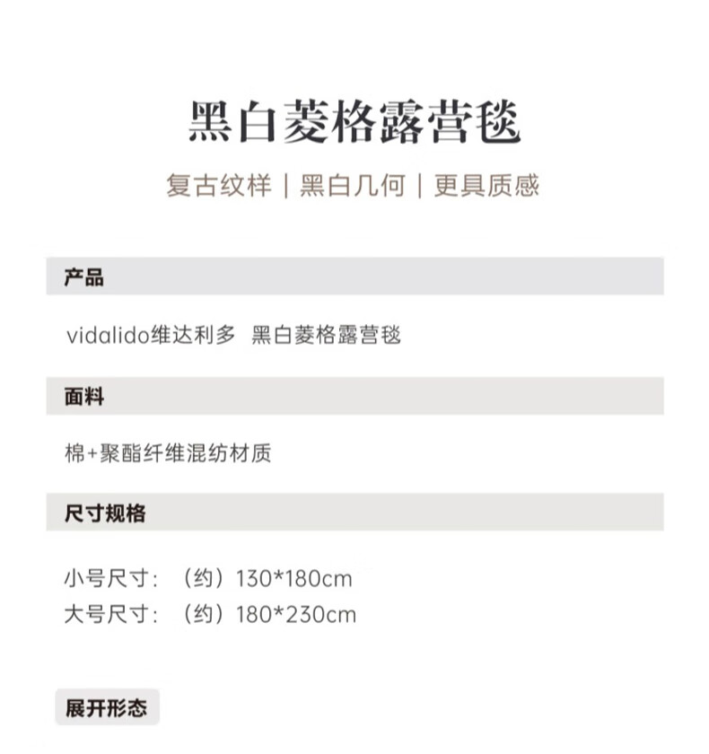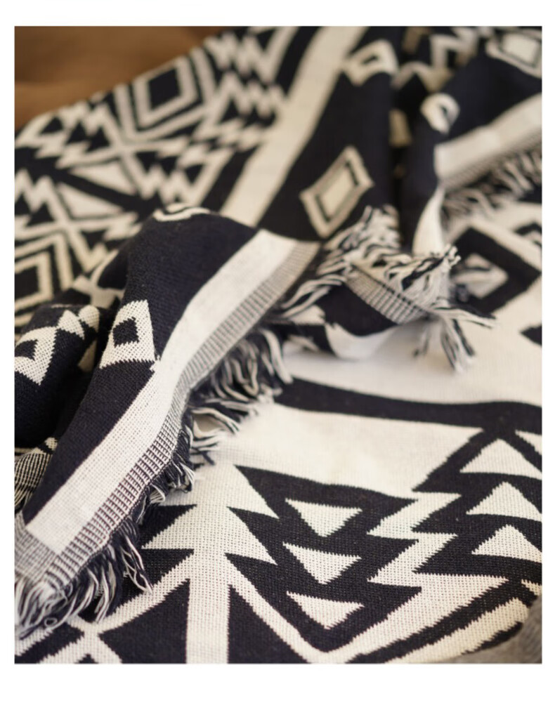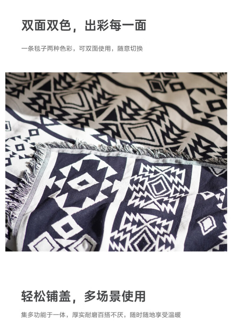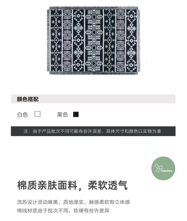 vidalido维达利多户外露营毛毯土耳其黑白菱格复古沙发毯地毯北欧棉布 黑白菱格180*230cm