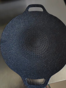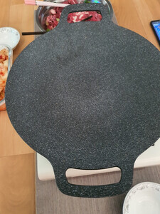家里有韩式的煎肉锅,看这个烤盘就被外形吸引了,买的是没有出油口的,33cm日常一家人使用已经足够了。煎了两回肉了,锅还算好清洗,不过背后不太好打理,但这个价也算值了。