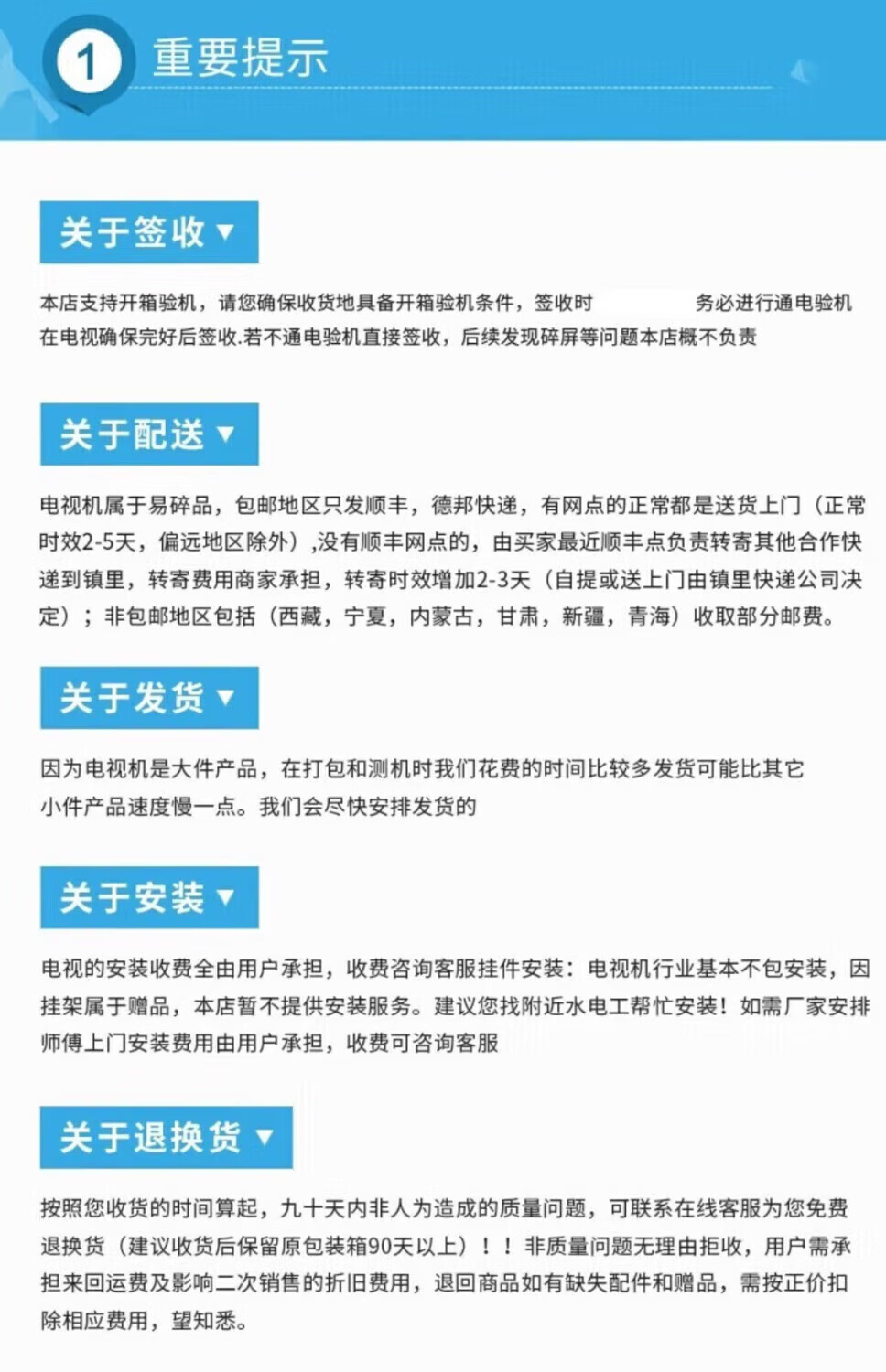这次为家人购置电视机的过程,简直就是一场恶梦,到今天一直挥之不去。 一开始就感觉出色彩不好,灰暗,不鲜艳。当时也没找到调整功能(没这个设置)。后来联系客服,说是让“按某键后马上按2580,后再调整”,因为我在外面,想以后回家时再调整试试。 结果,还没等调试,家人就来电话说,“电视机打不开了”。因为家人想看大阅兵着急,我赶紧赶回家。回家一看,是遥控失灵了,但按电源开关还是可以开机的。 但这个时候看到的图像是白刺拉瞎的,心里很不是滋味儿,觉得很对不起家人! 在我心目中,我们的电视机技术早已过关了,无需再考虑质量问题。咋就让我摊上了这么个事儿呢? 真是想不通!苦脑透了!