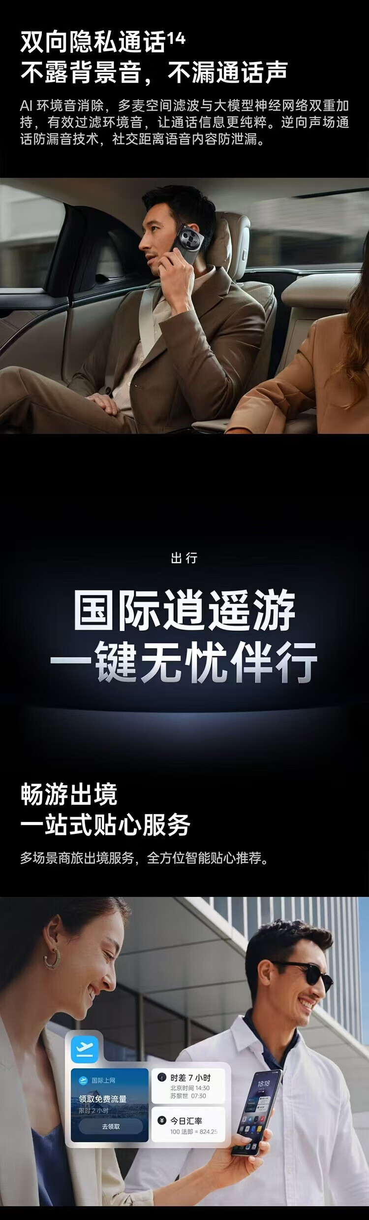 AI大模型,卫星通话,轻薄,LTPO屏幕,高频PWM调光,全焦段影像,潜望式长焦,无线充电,NFC,红外遥控,大底主摄