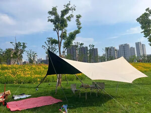 天幕很不错,第一次搭很顺利,遮阳效果不错,出去游玩必备,氛围感十足!好评支持一下。套装购买省心一次安排到位。