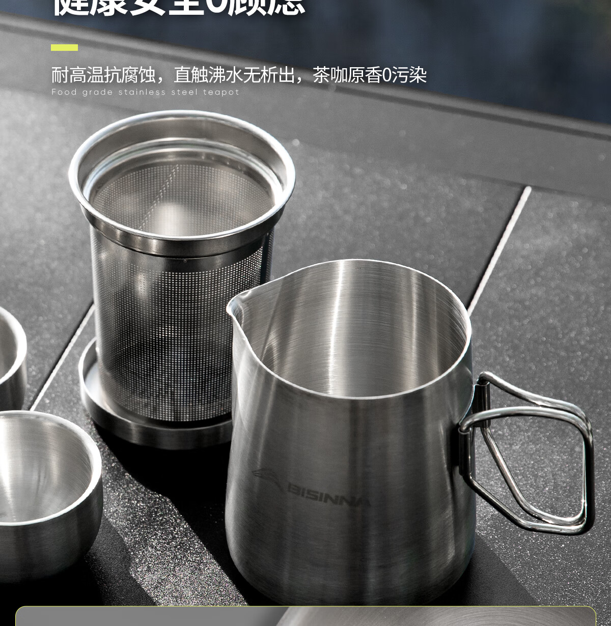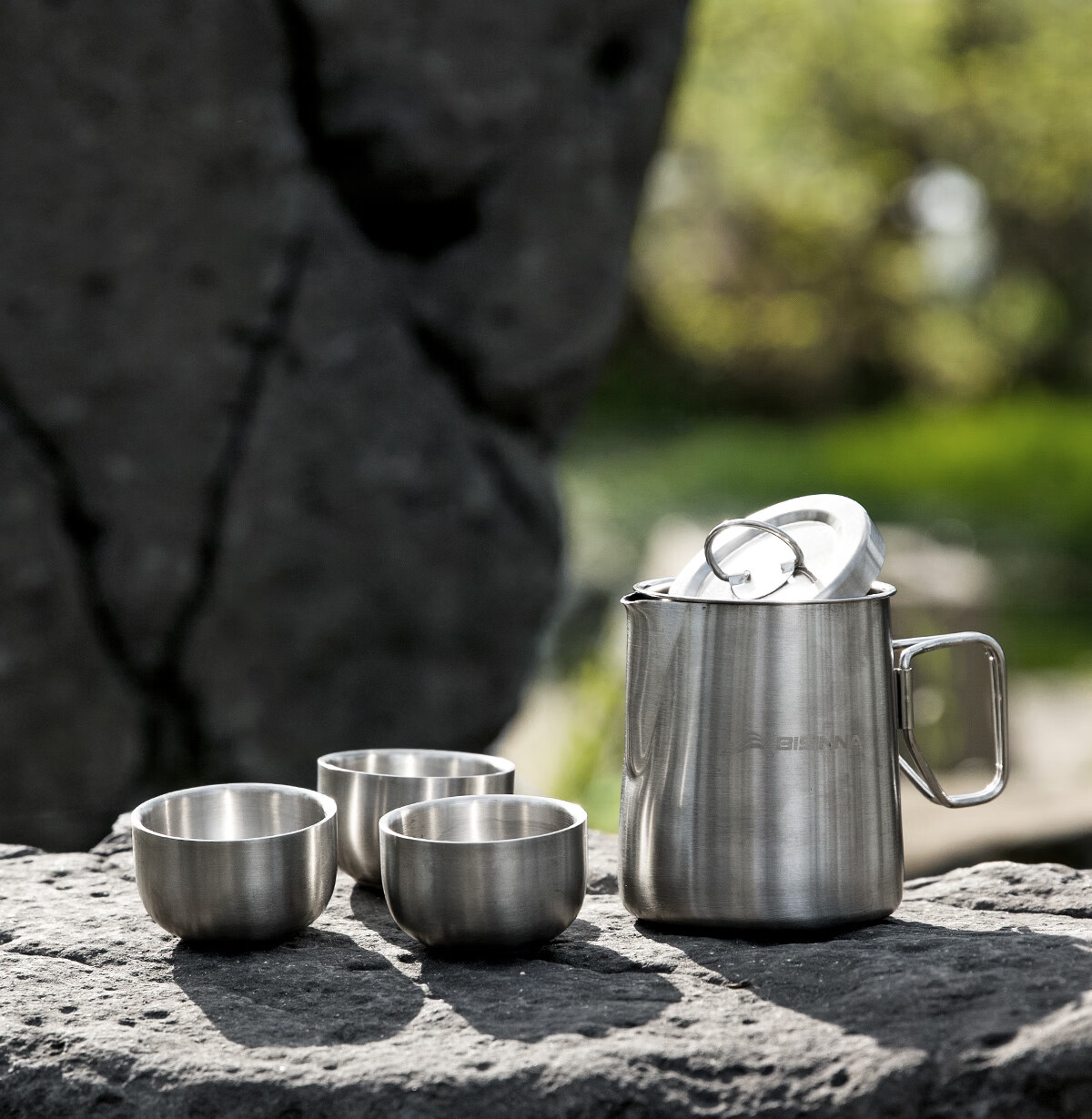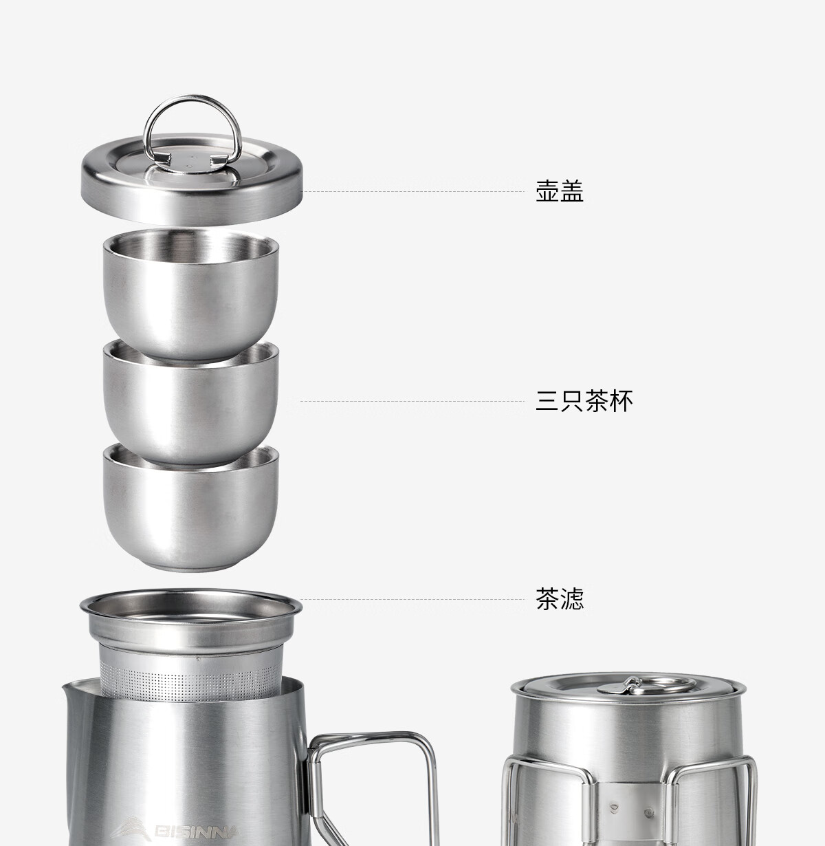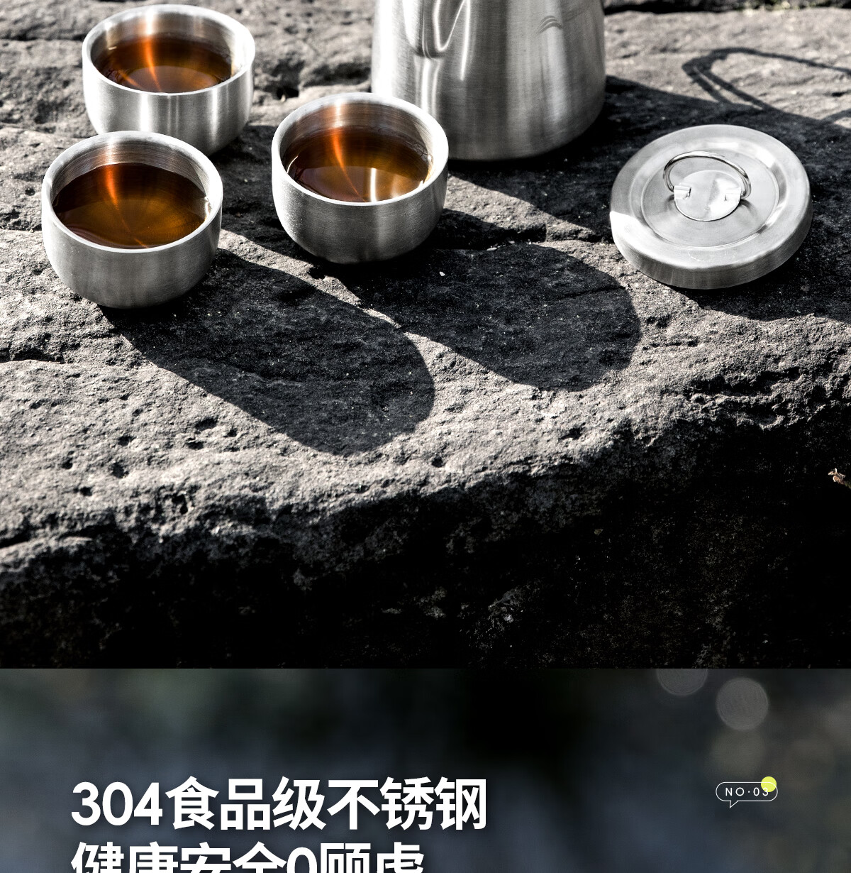 北山狼 不锈钢户外茶具便携功夫泡茶器隔热防烫旅行煮茶套装 0.3L茶壶+茶杯*3【食品级不锈钢