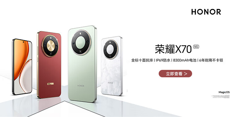 荣耀X70 金标十面抗摔 8300mAh青海湖电池 IP69防水 5G手机分期免息 朱砂红 8GB+128GB 官方标配