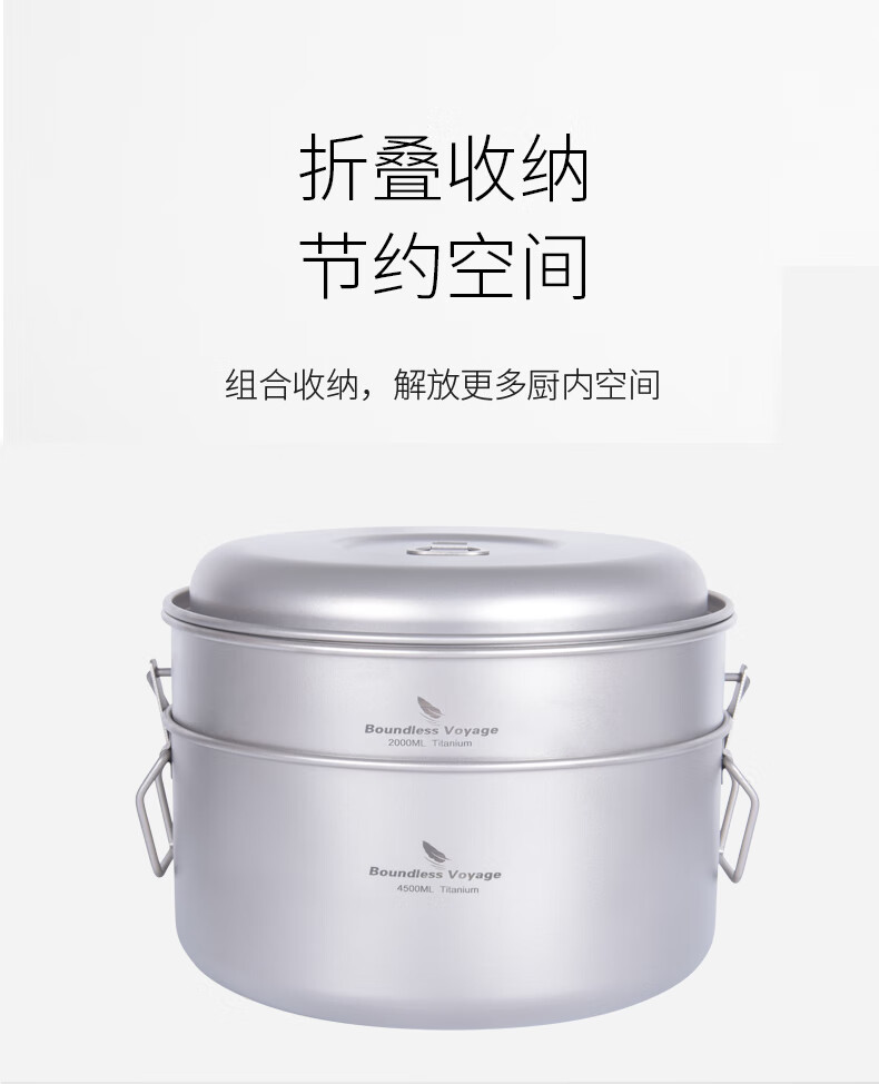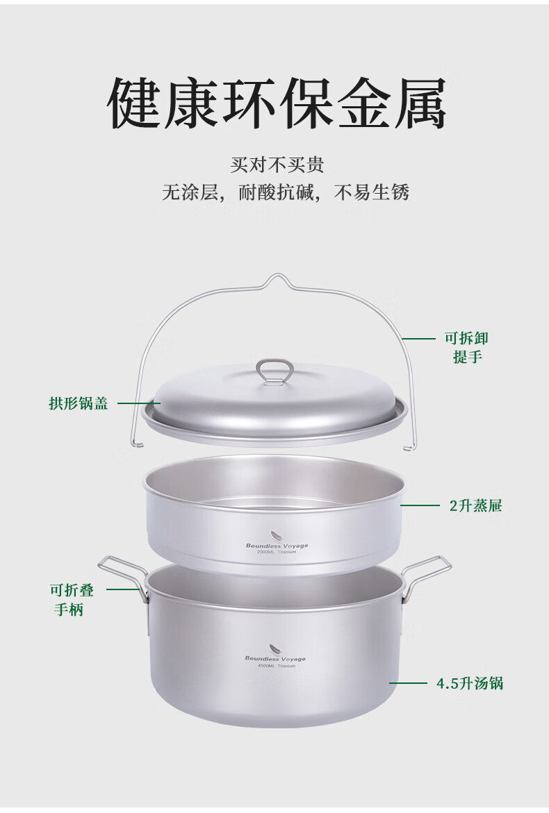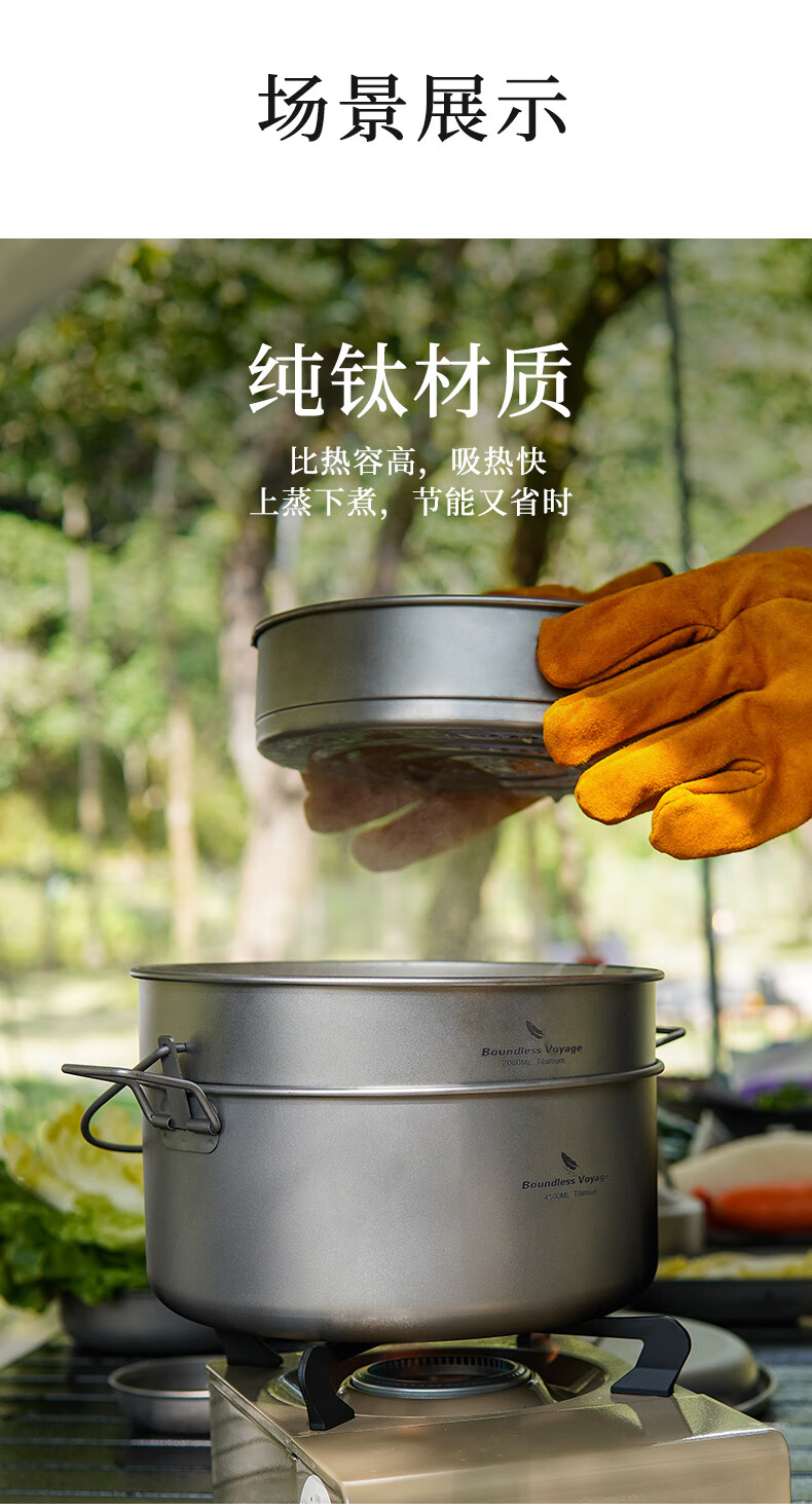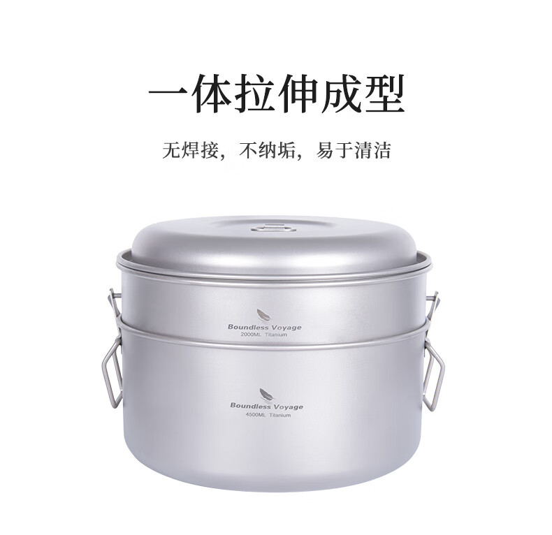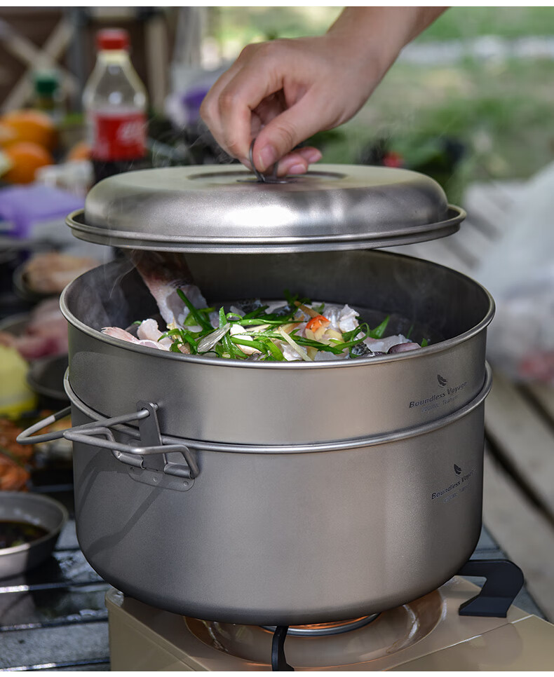 必唯(BOUNDLESS VOYAGE)必唯纯钛户外蒸锅2.2L汤锅轻量便携露营火锅野炊钛锅野营锅具炊具 Ti2111C 2.2L汤锅+2L蒸隔