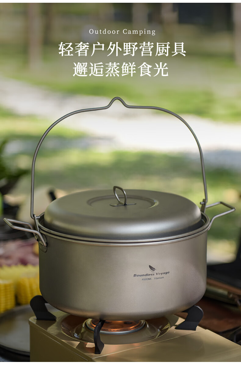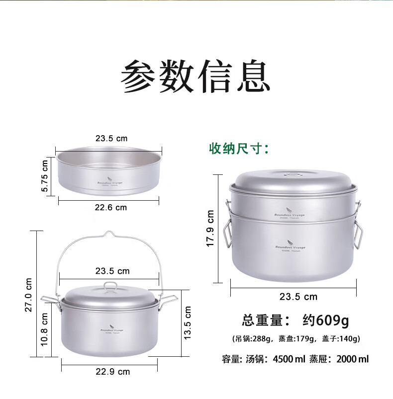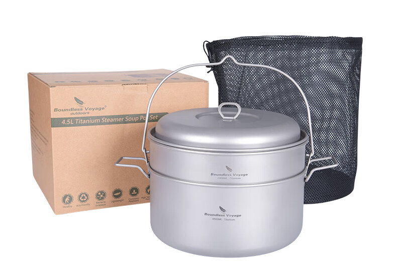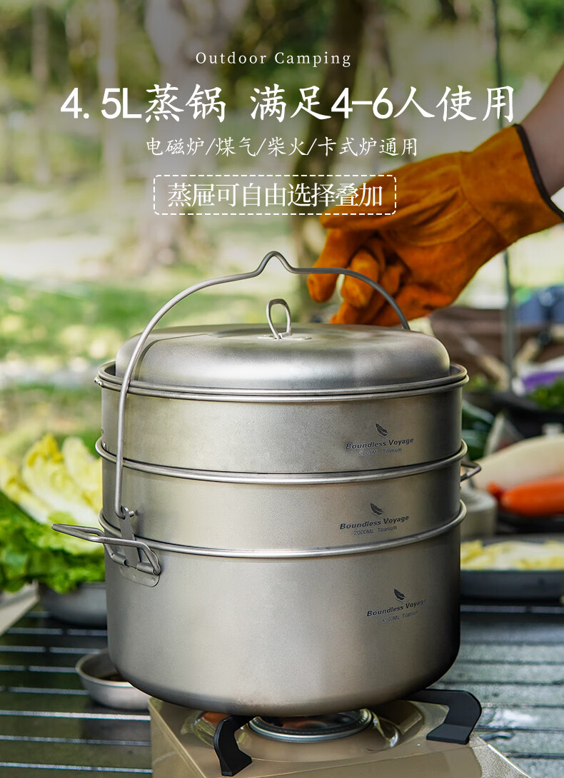必唯(BOUNDLESS VOYAGE) 纯钛户外蒸锅4.5L便携汤锅露营锅具野营平底锅火锅大容量蒸隔 1L水壶+不沾锅+4.5L蒸锅
