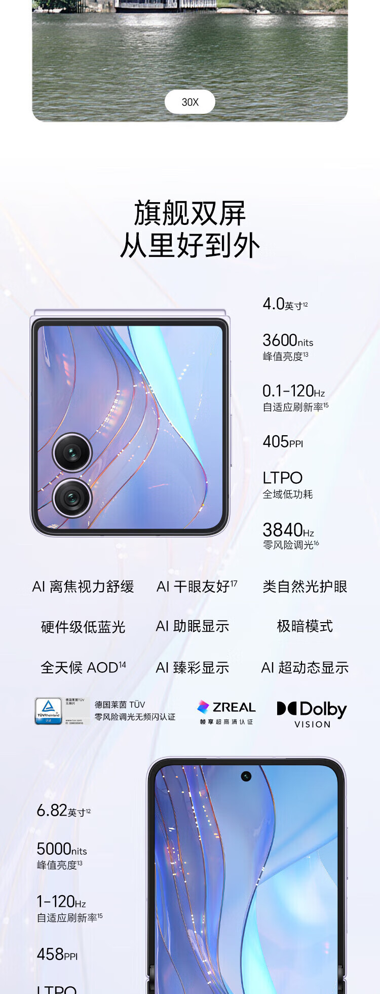 荣耀Magic V Flip2是实用派标杆。骁龙8 Gen3+2亿主摄性能影像强,5500mAh电池+双快充续航无忧,外屏适配广,折痕浅且防水。