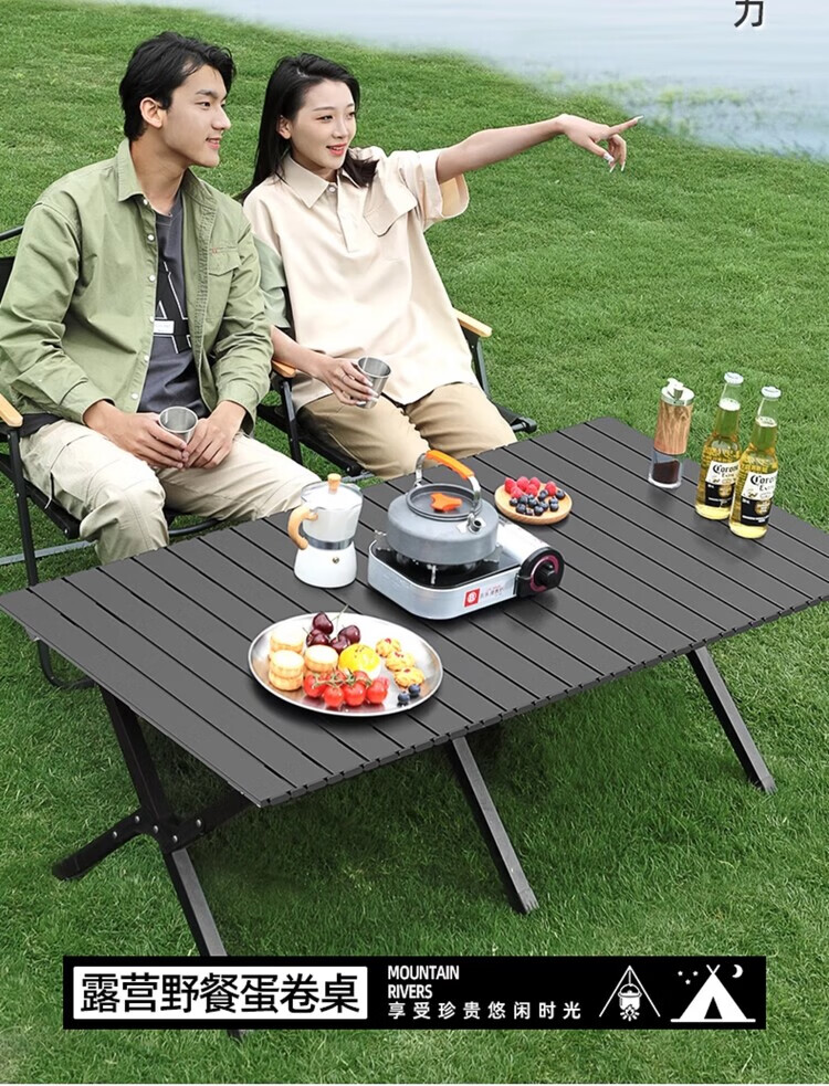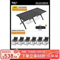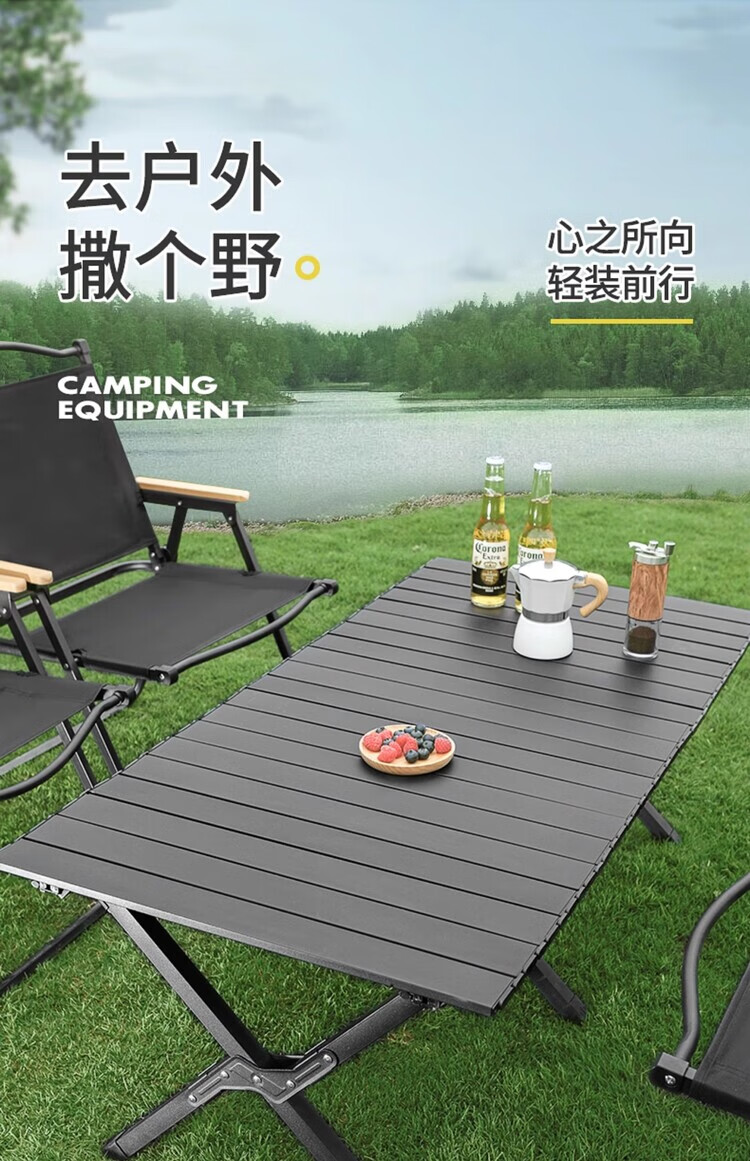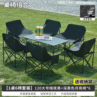 原始人户外折叠桌子便携蛋卷桌露营装备全套折叠野餐桌椅野炊便携野营桌 120磨砂黑色+加大黑克米特椅*6