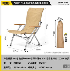 原始人户外折叠椅躺椅露营高背海狗椅午休椅钓鱼沙滩椅航空铝便携 【卡其】铝合金海狗椅