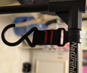 买了个挂东西的置物架,中号的,不高,从横杆到地面才60多公分,但是我觉得也够了,露营坐着正好能拿到,还挺实用的,多买了4个钩子。