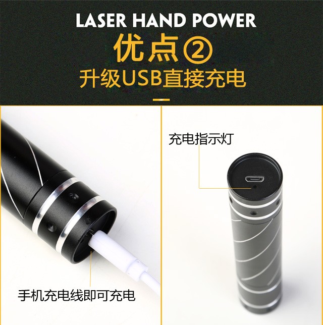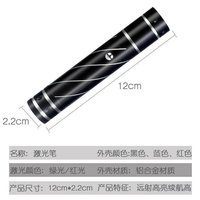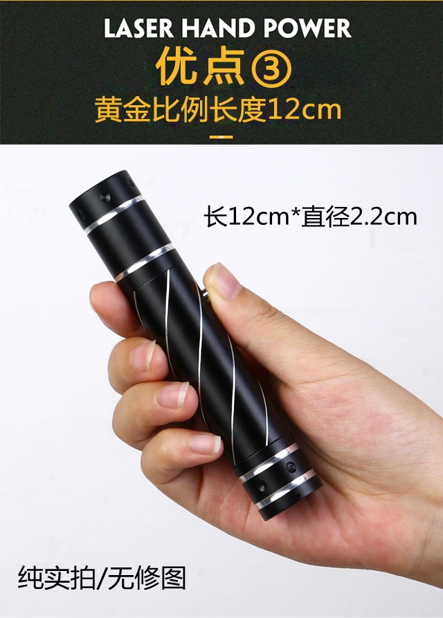 视频画质不好。请见谅 刻字:跟商家说的刻字也刻了 光线:很亮 射程:大约500 质量:可以 续航:~12个小时 光线:好 建议:那些手残的。有多动症的。保养不好的就不要买了。不然容易损坏。 1.不能摔 2.长时间不用,每隔一段时间充一次电。 3.单次使用时间不超过一分钟。 产品很好,值得推荐。