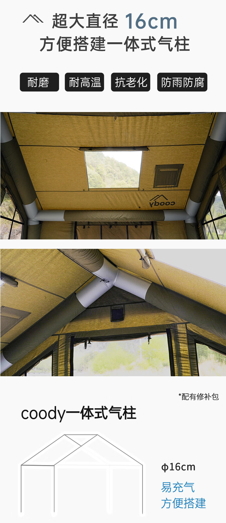 之前买了帐篷,这次买了起柱,有了气柱,之后支撑力更好了,空间也变得更大了。之前用支架总是也撑不好,门厅软塌塌的双11 做活动购买价格非常划算,质量很好,用料很厚实