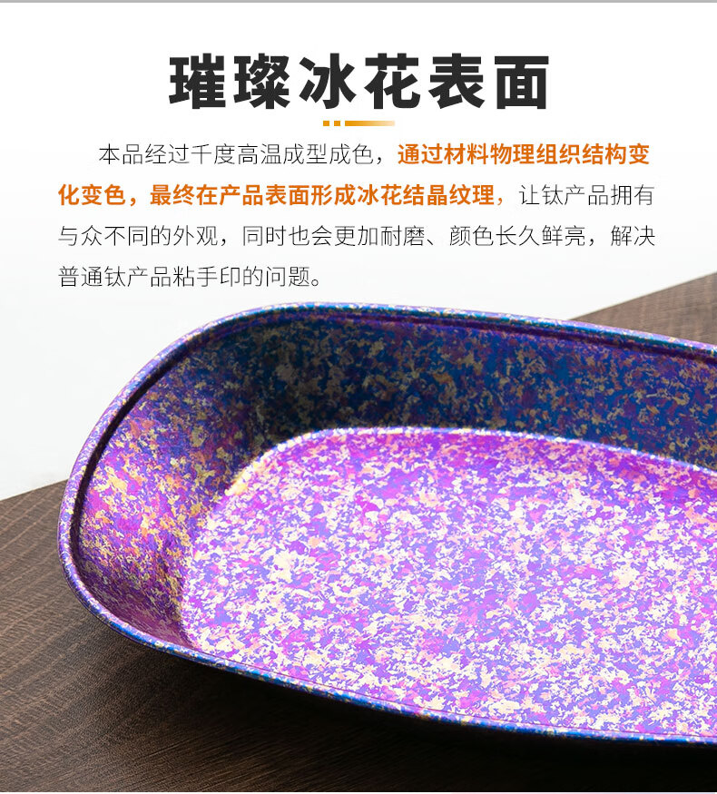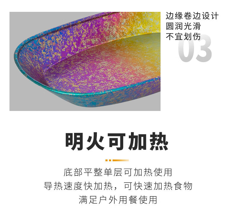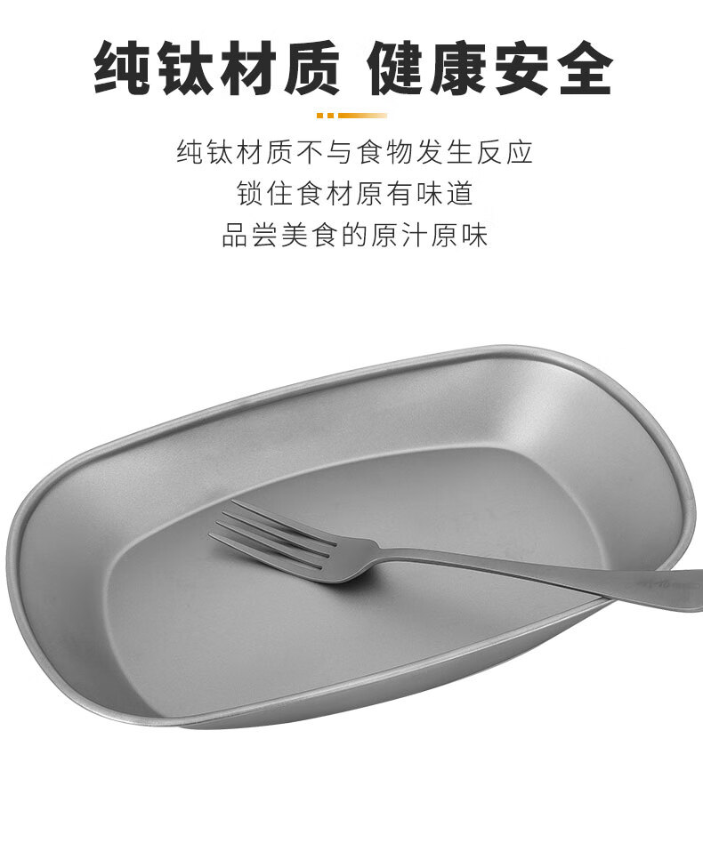 纯钛餐盘 超轻便捷 无重金属 明火加热 抗酸抗碱 易清洗 尺寸 257*161*35mm 锁住食材原味 边缘卷边设计 圆润光滑 样式非常漂亮 一年四季都可以使用 比别的户外装备轻 抑菌 携带方便