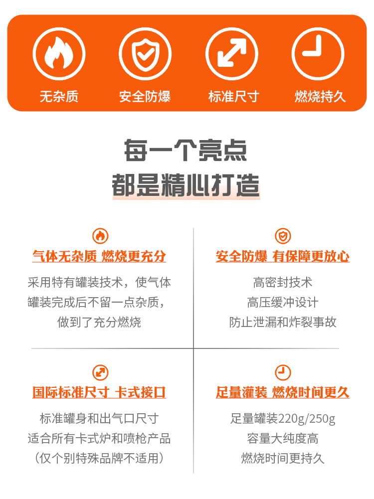 一次性气罐安全可靠,包装完好无损,气罐很有分量,火焰稳定,价格很实惠,以后出门野餐的话可以自由发挥。质量杠杠的够用不错,第一次用户外炉,感觉有质感,客服很耐心指导讲解火焰颜色蓝色,无杂质,效果杠杠滴!燃烧安全且充分,主要是方便携带。