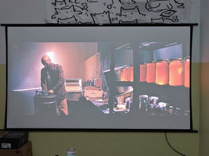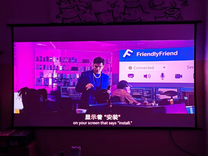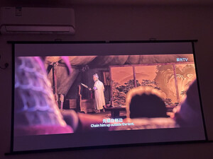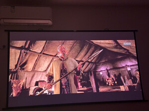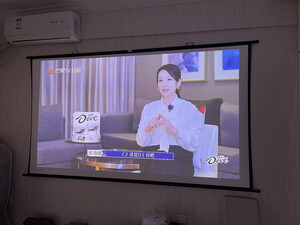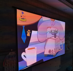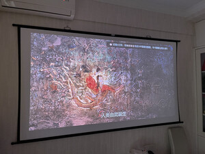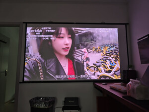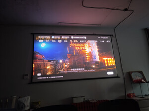 100寸幕布果然大,投影上去画质也比大白墙来的更加细腻,颜色也更正了,这是白天拉窗帘的效果,非常满意