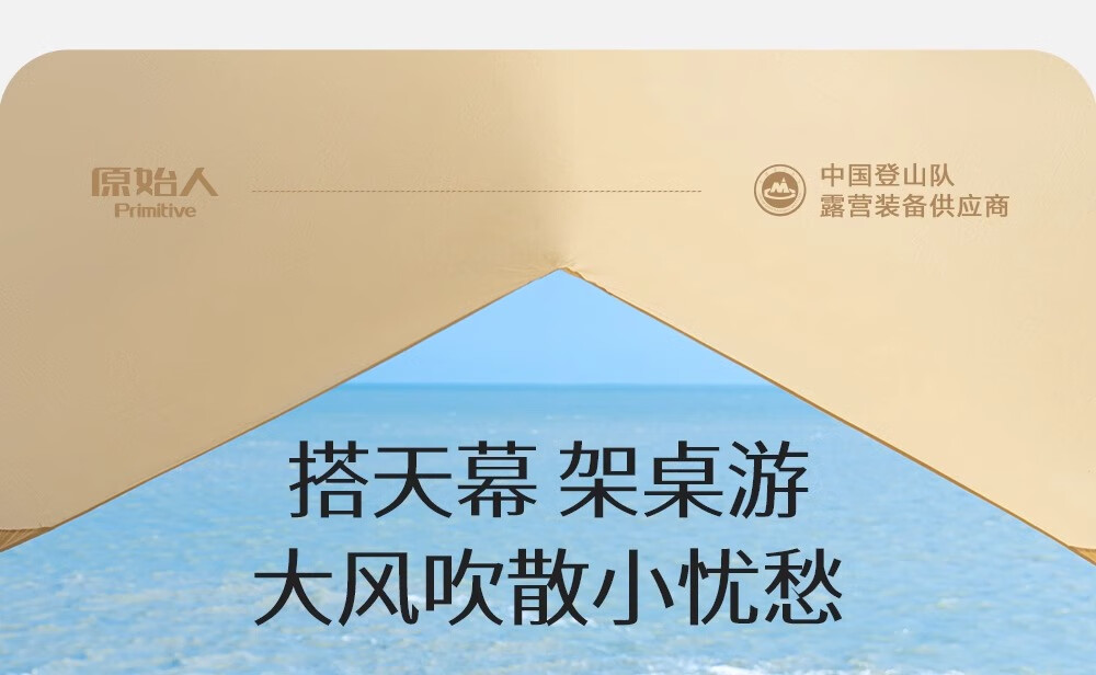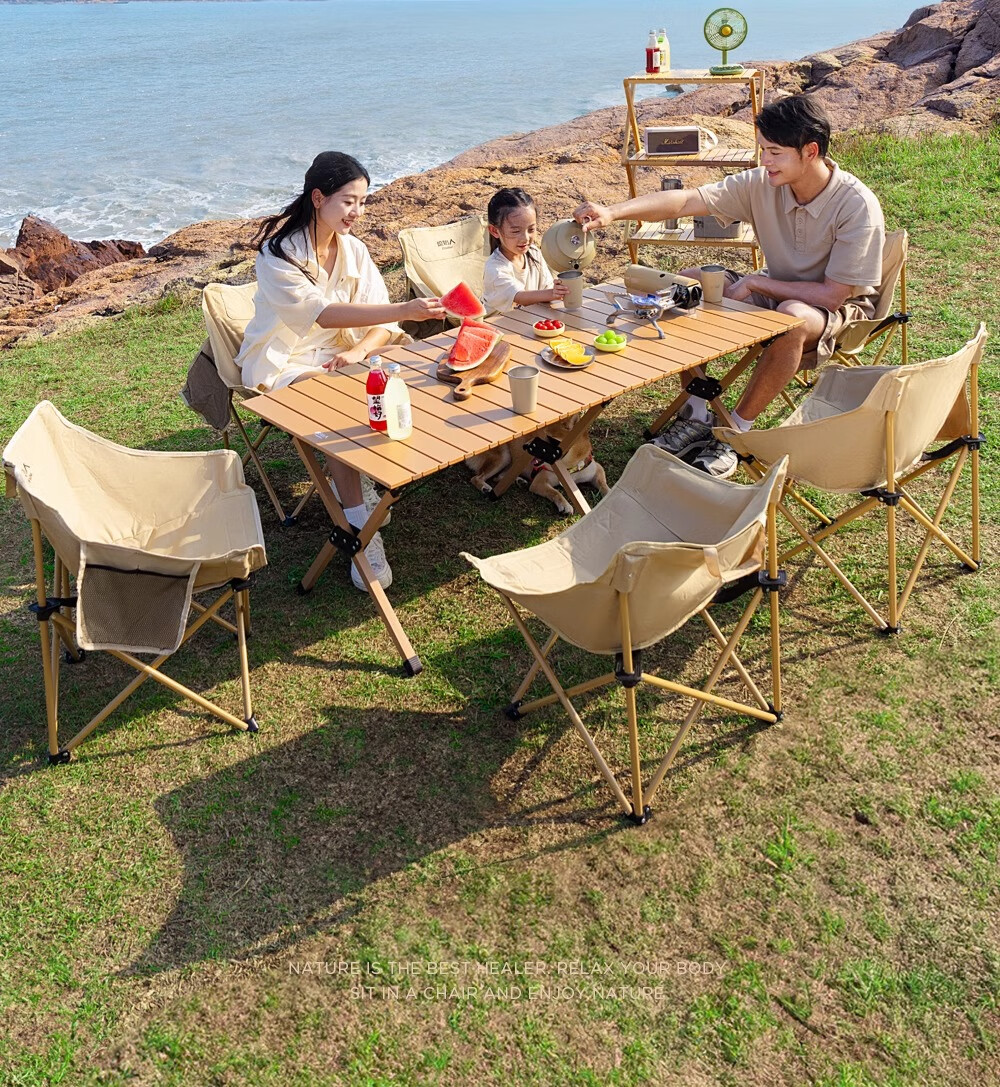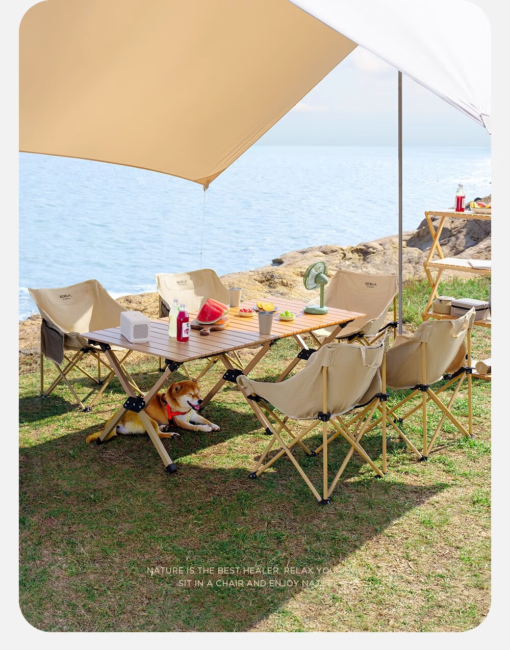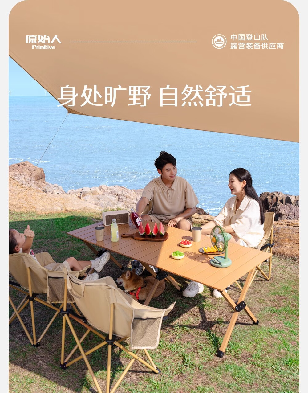 原始人露营桌椅户外折叠椅子桌子一体便携月亮椅野餐野营桌椅套装 150原木色蛋卷桌+卡其*6