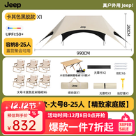 JEEP黑胶天幕户外遮阳防雨加强防晒沙滩津布露营凉棚雨棚懒人六角天幕 【精致家庭版】黑胶一桌+卡其克米特椅*6