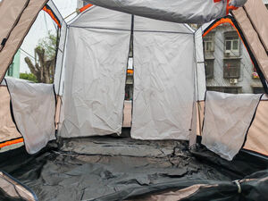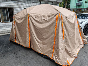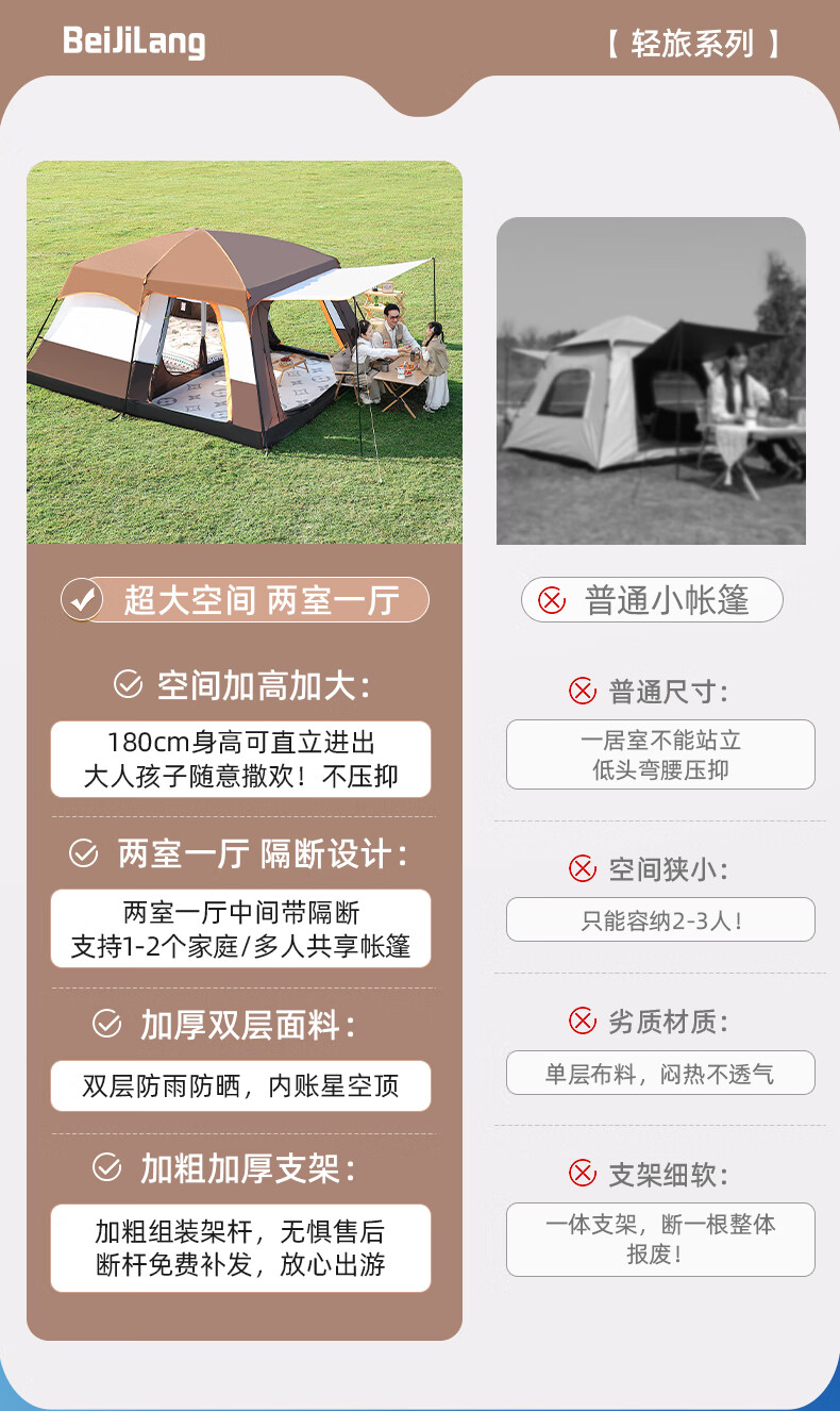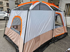 店家发货比较快,服务态度也很好,我是购买用于自驾游,原是想购车尾帐篷,但考虑到防雨,经与客服沟通后,购买了全包二室小号的,收到后在立即就在车库安装起来,因不是很熟练,一个人用了一个小时左右,整体效果很好,空间很大,我一米七身高完全能站直,内帐窗户出入口处均有沙网,外帐对应处也是能卷起来的,便于天晴天通风,有雨可放下,防水效果很好(用自来水作了检验),不足是门厅天幕是利用的门帘,有点小,正好我之前购有车边天幕,最后希望能耐用。