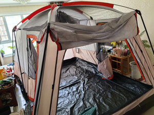 在客厅先支棱起来,周末准备进山,非常nice。比预期的要好很多,也比较坚固。就是顶横梁有点细,不知道强度怎么样,感觉还可以,只要能用10次,就达到我的目的了,一般十次之后肯定换新的了,如果有配件保障,多给一副横梁就完美了。