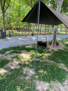天幕重量挺轻,防水防晒效果都不错,袋子防水也有提手,有黑胶,大热天很防晒,下雨天暴雨很防水,四级大风不在话下,这个天幕不错