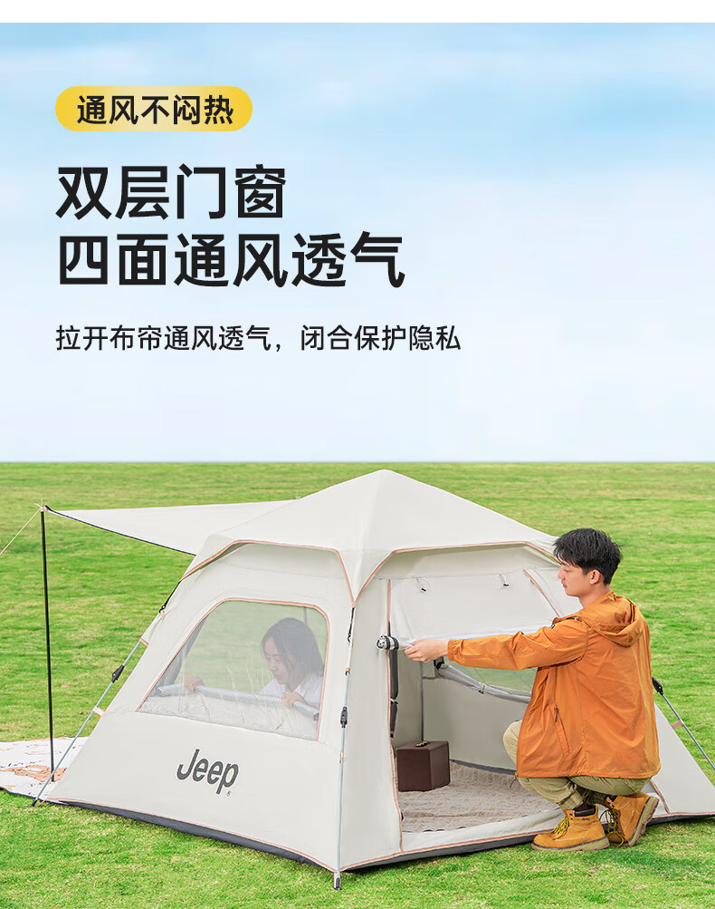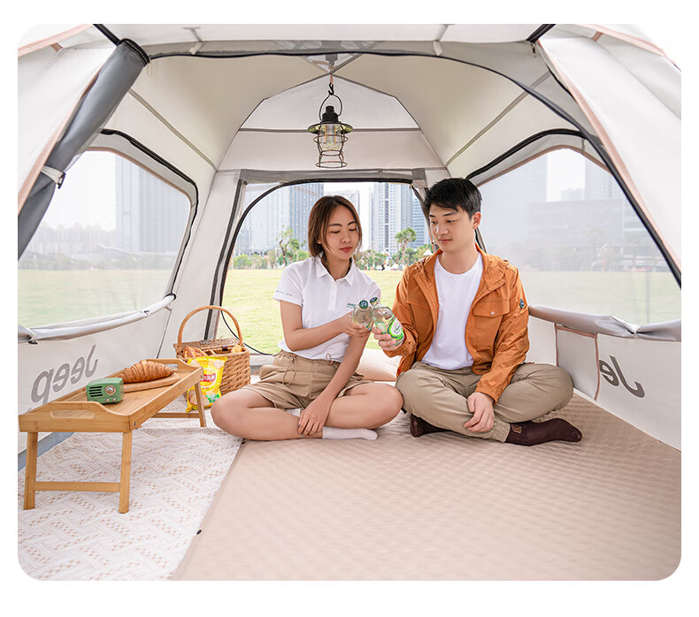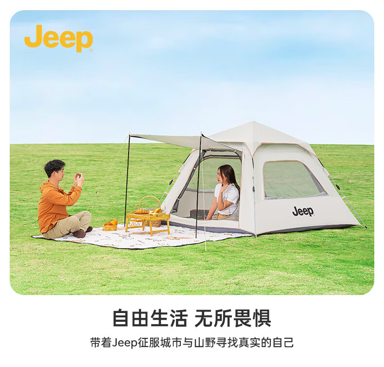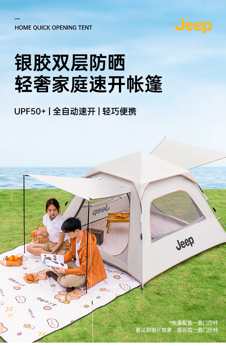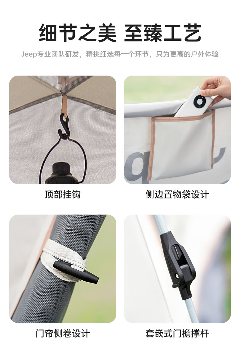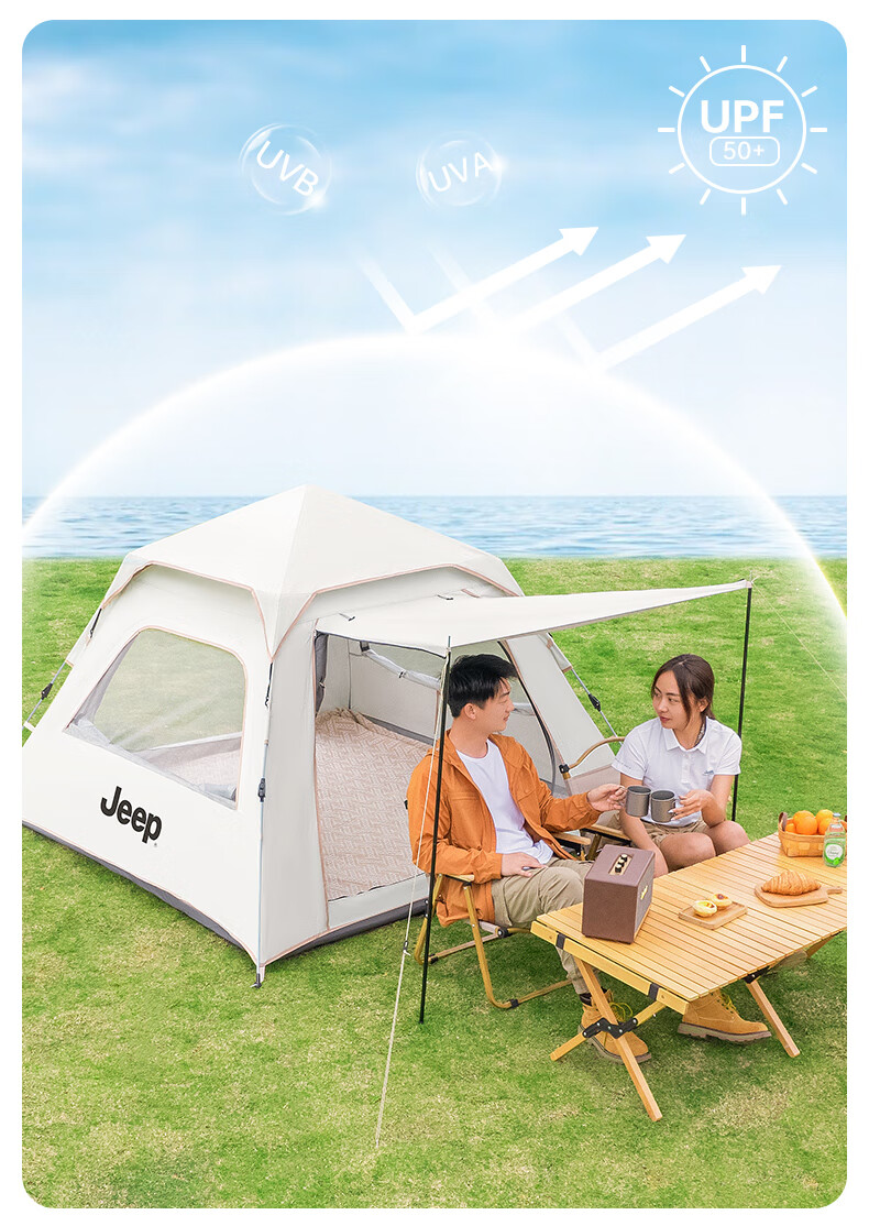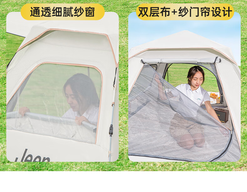 JEEP天幕帐篷户外露营帐篷全自动速开便捷天幕二合一防晒家庭野营装备 大号米白黑胶款