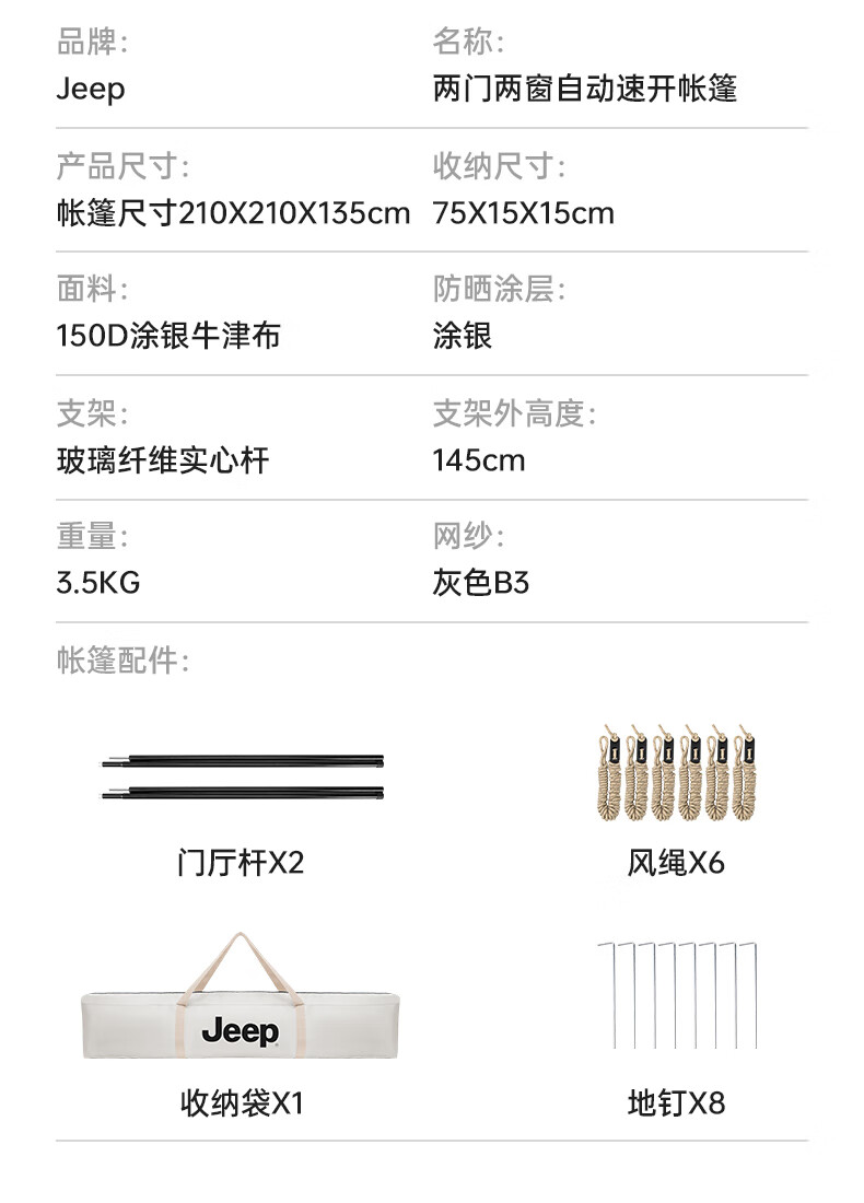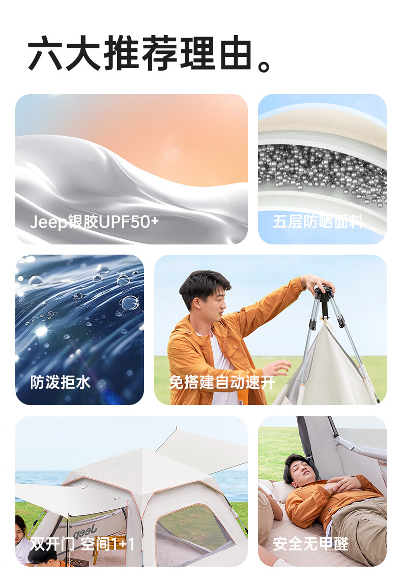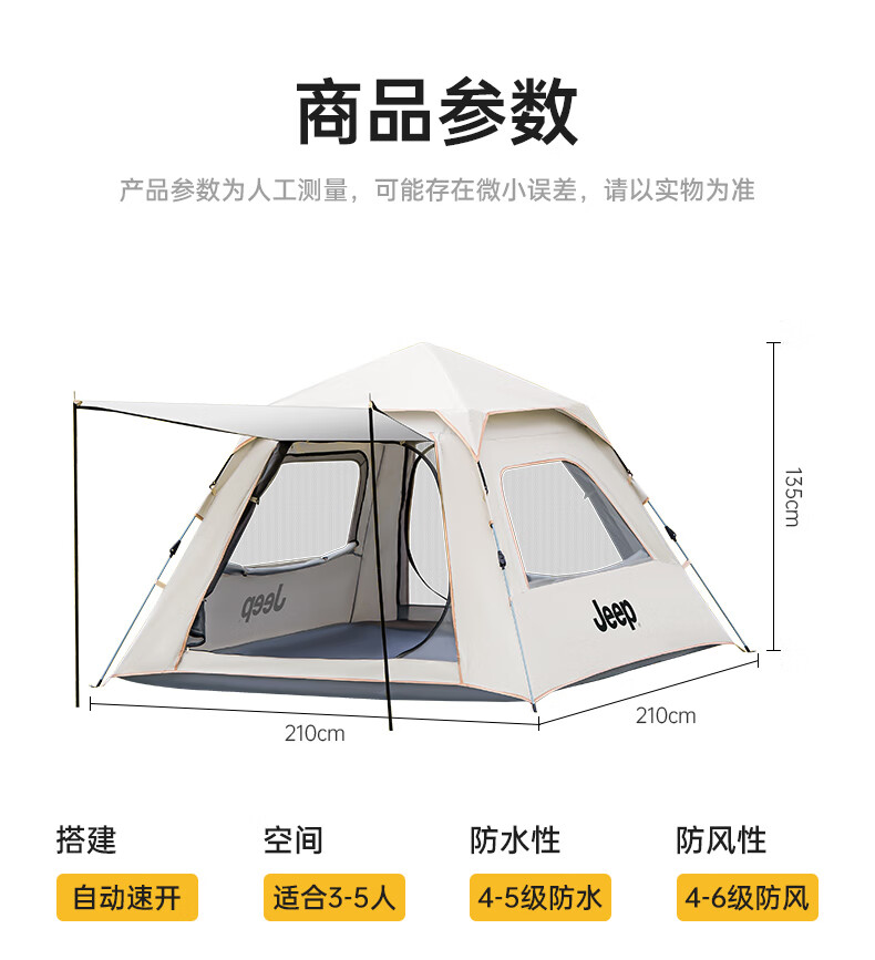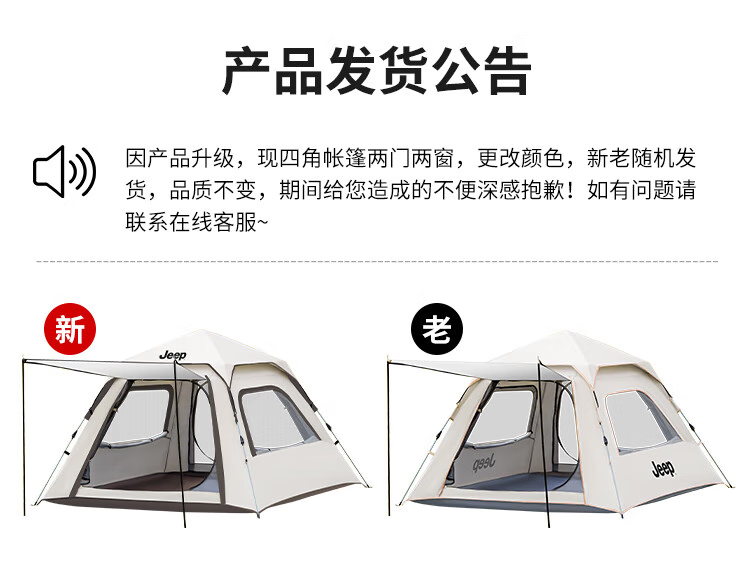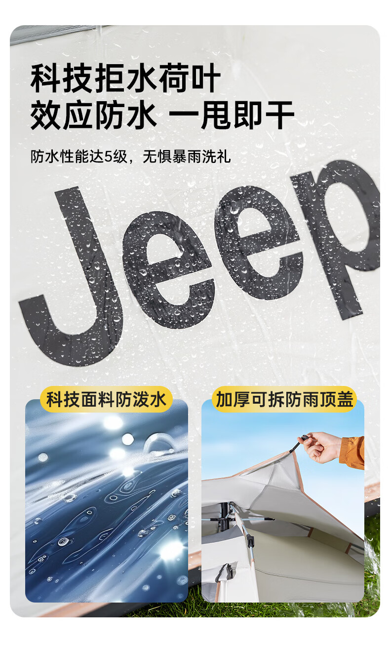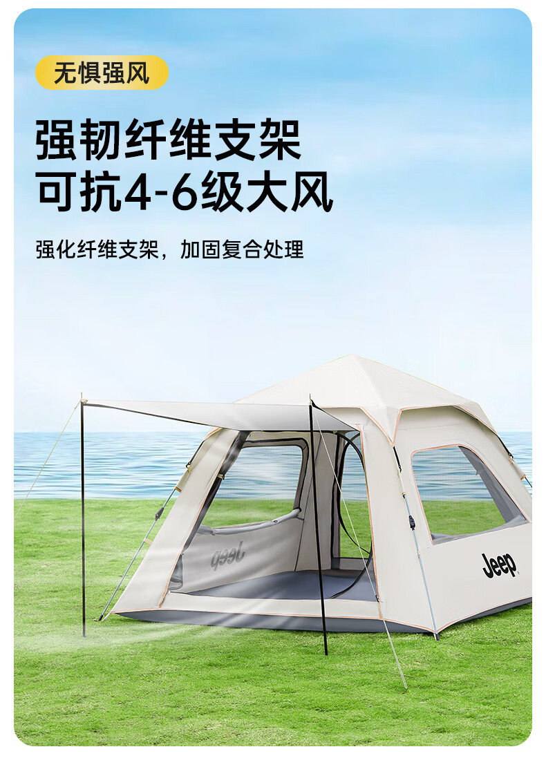 JEEP天幕帐篷户外露营帐篷全自动速开便捷天幕二合一防晒家庭野营装备 大号米白黑胶款