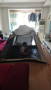 第一次野营搭帐篷,没想到这款很容易,自己像伞一样张开了,对照京东上的商品视频,很快完成,帐篷里再铺上另外购买和准备的隔潮垫,或躺或坐在里边很是舒服,青草的清香,青蛙鸣叫,体验很棒。