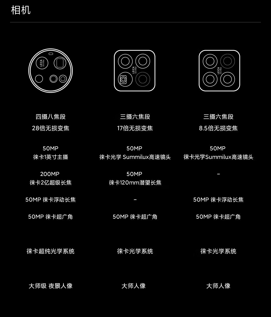 卫星通话,LTPO屏幕,高频PWM调光,全焦段影像,潜望式长焦,防水防尘,无线充电,NFC,红外遥控,大底主摄,等深微曲屏
