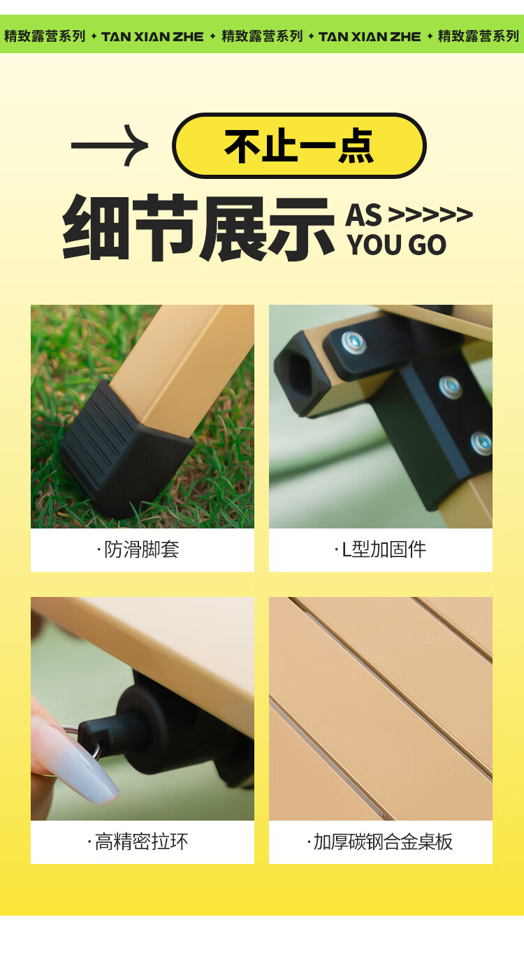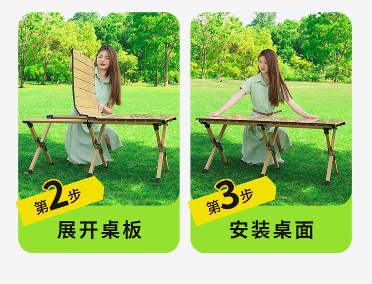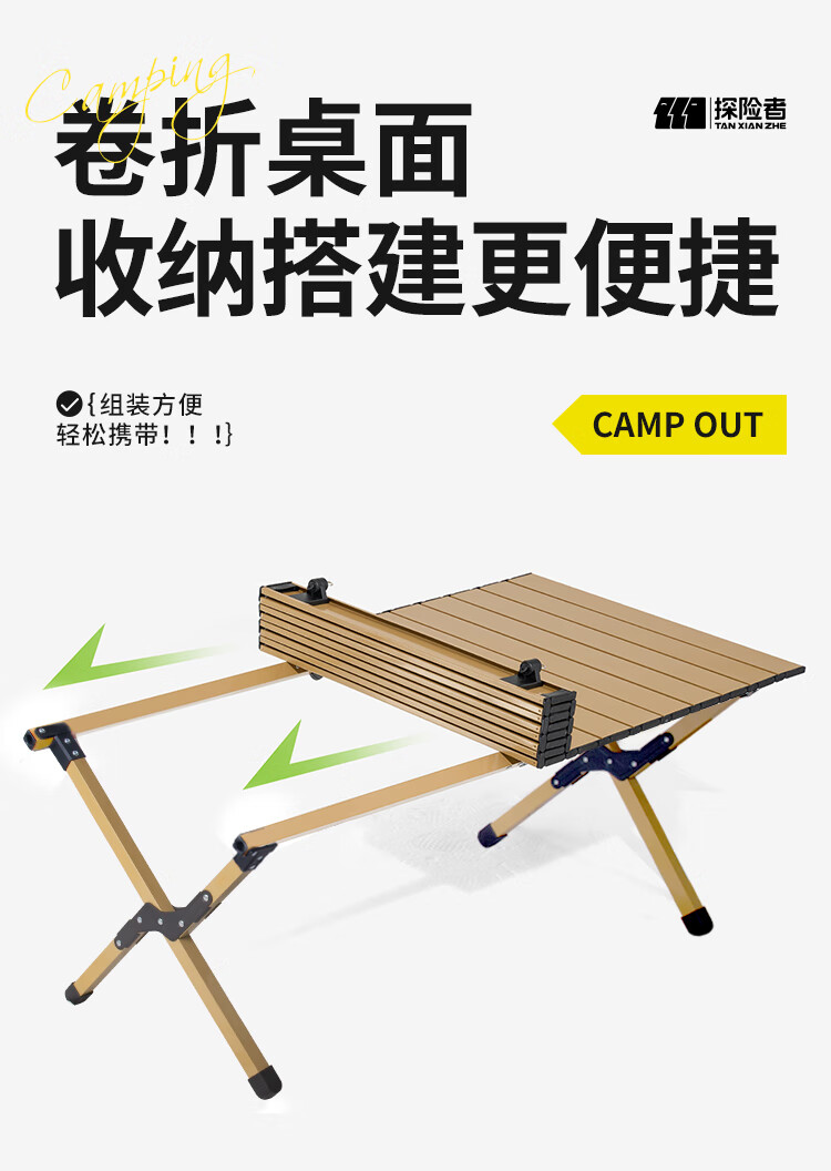 便携性与收纳:蛋卷桌的设计太绝了!桌面可卷折收纳,搭配可折叠桌腿,装进收纳袋后体积小巧,重量轻(女生单手拎无压力),轻松塞进后备箱甚至背包侧袋,真正实现“说走就走”。展开和收纳全程不用工具,10秒搞定,户外省心第一名! 稳固性与承重:桌腿采用加粗铝合金材质,支架结构科学,实测承重50斤以上毫无压力(放烤盘、炊具、食材堆满都没问题),沙地或草地使用时调节脚垫高度即可适应地形,完全不会摇晃。桌面是加厚榉木拼接板,纹理自然,防水防油污,湿布一擦就干净,耐用性拉满! 细节设计: 桌面边缘圆角打磨,防止磕碰划伤,安全性满分; 桌腿卡扣和螺丝连接处严丝合缝,开合顺滑不卡顿; 高度设计合理(约45cm),搭配露营椅使用舒适,久坐不累腰; 可选配扩展桌面或杯槽配件,玩法多样,实用性更强。 适用场景:亲测露营野餐、河边钓鱼、阳台办公、家庭火锅聚餐都适用!尤其适合带娃家庭,小朋友在桌上画画、拼积木也超级稳当。 物流与售后:包装严实无磕碰,配件齐全(含收纳袋、说明书),商家还贴心赠送了桌布和防风地钉,售后主动跟进指导使用,服务超赞!